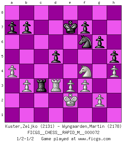 Last move : 1/2-1/2 2014 August 26 1:21:32 [Event "FICGS__CHESS__RAPID_M__000072"] [Site "FICGS"] [Date "2014.06.01"] [Round "1"] [White "Kuster,Zeljko"] [Black "Wyngaarden,Martin"] [Result "1/2-1/2"] [WhiteElo "2131"] [BlackElo "2178"] 1.d4 d5 2.Nf3 Nf6 3.c4 c6 4.e3 e6 5.Nbd2 c5 6.cxd5 exd5 7.b3 Nc6 8.Bb2 cxd4 9.Nxd4 Bd6 10.Rc1 Bd7 11.Bd3 O-O 12.O-O Re8 13.Nb5 Be5 14.Bxe5 Rxe5 15.Nf3 Bg4 16.Be2 Re7 17.Nfd4 Bxe2 18.Qxe2 Rc8 19.Rfd1 Nxd4 20.Nxd4 Rec7 21.Qb2 h5 22.Ne2 Ng4 23.h3 Qf6 24.Qxf6 Nxf6 25.Rxc7 Rxc7 26.Nf4 Rc2 27.a4 Rc5 28.h4 Kf8 29.Kf1 Ke7 30.Ke2 g6 31.f3 Rc3 32.Rd3 1/2-1/2 Queen's pawn game Kingside Castling by player Black (move 11) Kingside Castling by player White (move 12) This chess game ended in a draw. Follow this game move after move (download)Whoever sees no other aim in the game than that of giving checkmate to one's opponent will never become a good Chess player. (Euwe) Die Leute spielen gegen mich seit 15 Jahren unter Ihren Möglichkeiten. (Robert James Fischer) Creo que una cierta cantidad de temperamento es esperada de los genios del Ajedrez. (Ron Gross) Que feriez-vous si vous étiez en train de jouer aux échecs et que la fin du monde arrive ? Je continuerais à jouer. (Saint Borromée) Do not put your faith in what statistics say until you have carefully considered what they do not say. (William W. Watt)