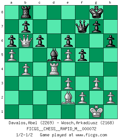 Last move : 1/2-1/2 2014 September 4 7:54:41 [Event "FICGS__CHESS__RAPID_M__000072"] [Site "FICGS"] [Date "2014.06.01"] [Round "1"] [White "Davalos,Abel"] [Black "Wosch,Arkadiusz"] [Result "1/2-1/2"] [WhiteElo "2269"] [BlackElo "2168"] 1.d4 Nf6 2.c4 e6 3.g3 d5 4.Nf3 Be7 5.Bg2 O-O 6.O-O dxc4 7.Qc2 a6 8.a4 Bd7 9.Qxc4 Bc6 10.Bg5 Bd5 11.Qc2 Be4 12.Qc1 h6 13.Bxf6 Bxf6 14.Nbd2 Bh7 15.Rd1 Nd7 16.Nc4 c6 17.Nfe5 Rb8 18.Qc3 Qc7 19.Nxd7 Qxd7 20.e3 Rfd8 21.Rac1 Bf5 22.Bf3 Qe8 23.Ne5 Rbc8 24.b4 Qf8 25.Qc5 Rb8 26.Qa5 Bxe5 27.dxe5 Rxd1+ 28.Rxd1 Bc2 29.Rd4 Bb3 30.Be2 Bd5 31.Qb6 f6 32.Rf4 f5 33.Rd4 Qf7 34.a5 1/2-1/2 Catalan Opening Kingside Castling by player Black (move 5) Kingside Castling by player White (move 6) This chess game ended in a draw. Follow this game move after move (download)A thorough understanding of the typical mating continuations makes the most complicated sacrificial combinations leading up to them not only not difficult, but almost a matter of course. (Siegbert Tarrasch) Es ist besser die Steine des Gegners zu opfern. (Savielly Grigorievitsch Tartakower) Si el Ajedrez es una ciencia, es la mas inexacta. Si el Ajedrez es un arte, es demasiado inexacto para ser visto como tal. Si el Ajedrez es un deporte, es demasiado esotérico. Si el Ajedrez es un juego, es demasiado exigente para ser solo un juego. Si el Ajedrez es una aventura, es una muy demandante. Si el Ajedrez es una pasión, es una muy gratificante. Si el Ajedrez es la vida, es una muy triste. (Anónimo) Le profane ne songe pas à la somme de jouissance dont il se prive, qui méconnaît ce jeu aux ressources aussi variées que passionnantes. (Jean-Marie Jeanton-Lamarche) It is not titles that honor men, but men that honor titles. (Niccolo Machiavelli)
