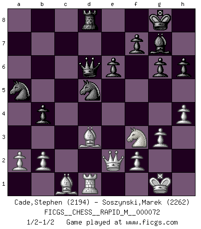 Last move : 1/2-1/2 2014 June 15 13:1:52 [Event "FICGS__CHESS__RAPID_M__000072"] [Site "FICGS"] [Date "2014.06.01"] [Round "1"] [White "Cade,Stephen"] [Black "Soszynski,Marek"] [Result "1/2-1/2"] [WhiteElo "2194"] [BlackElo "2262"] 1.d4 Nf6 2.c4 g6 3.Nc3 d5 4.Nf3 Bg7 5.Qb3 dxc4 6.Qxc4 O-O 7.e4 a6 8.Be2 b5 9.Qb3 c5 10.dxc5 Be6 11.Qc2 Nbd7 12.Be3 Rc8 13.Rd1 b4 14.Nd5 Bxd5 15.exd5 Nxc5 16.O-O Qd6 17.Rc1 Qb8 18.Bc4 Rfd8 19.Rfd1 Nb7 20.Qe2 Na5 21.Bxa6 Rxc1 22.Bxc1 Nxd5 23.g3 h6 24.Bd3 Qd6 25.h4 e6 1/2-1/2 King's Indian defense, 3.Nc3 Kingside Castling by player Black (move 6) Kingside Castling by player White (move 16) This chess game ended in a draw. Follow this game move after move (download)A bad plan is better than none at all. (Frank Marshall) Alles was am Schachbrett zählt sind gute Züge. (Robert James Fischer) El Ajedrez no es como la vida... ¡tiene reglas!. (Mark Pasternak) 'L'échange des dames est un coup dur pour les deux adversaires...' Un journaliste lors d'une partie du match Spassky-Fischer A government big enough to give you everything you want is strong enough to take everything you have. (Thomas Jefferson)