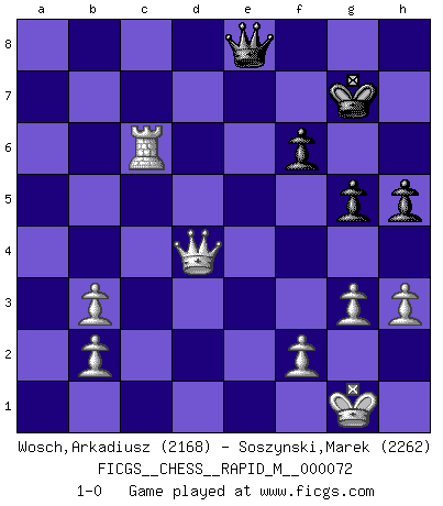 Last move : 1-0 2014 August 24 15:9:2 [Event "FICGS__CHESS__RAPID_M__000072"] [Site "FICGS"] [Date "2014.06.01"] [Round "1"] [White "Wosch,Arkadiusz"] [Black "Soszynski,Marek"] [Result "1-0"] [WhiteElo "2168"] [BlackElo "2262"] 1.e4 e5 2.Nf3 Nc6 3.Bc4 Bc5 4.c3 Nf6 5.d3 O-O 6.O-O d6 7.Bb3 Ne7 8.d4 Bb6 9.dxe5 Nxe4 10.Qe2 Nc5 11.exd6 cxd6 12.Be3 Bf5 13.Re1 Re8 14.Bxc5 Bxc5 15.Qc4 Bg6 16.Nbd2 Rc8 17.Qb5 d5 18.Ne5 Bf5 19.Qxb7 Qd6 20.Qb5 f6 21.Nef3 Rb8 22.Qf1 a5 23.Ne4 Bxe4 24.Rxe4 Rxb3 25.Rxe7 Rxe7 26.axb3 Qb6 27.Qd3 Rd7 28.Qe2 Kf7 29.Ne1 g6 30.Nd3 d4 31.Qg4 Rd8 32.c4 Bd6 33.Qe2 Bb4 34.g3 Qb7 35.Rc1 Re8 36.Qd1 Qe4 37.c5 g5 38.Qc2 Rc8 39.Qc4+ Kg7 40.Nxb4 axb4 41.Qxb4 h5 42.h3 Qe5 43.c6 Qe8 44.Qxd4 Rxc6 45.Rxc6 1-0 Giuoco Piano Kingside Castling by player Black (move 5) Kingside Castling by player White (move 6) Player White won this chess game. Follow this game move after move (download)It is no time to be playing Chess when the house is on fire. (Italian Proverb) Jede Eröffnung ist gut genug um gespielt zu werden, wenn nur ihr Ruf schlecht genug ist. (Savielly Grigorievitsch Tartakower) Peones: ellos son el alma de esta partida, solos forman el ataque y la defensa. (Philidor) Ce n'est pas pour s'amuser qu'il joue aux échecs : il célèbre un culte. (Vladimir Nabokov) Thibault, I ask for draw. Game 13876. - Sorry Ilmars, you won. (FICGS chat)