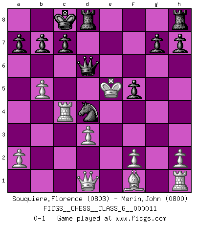 Last move : 0-1 2007 March 6 22:1:2 [Event "FICGS__CHESS__CLASS_G__000011"] [Site "FICGS"] [Date "2007.02.16"] [Round "1"] [White "Souquiere,Florence"] [Black "Marin,John"] [Result "0-1"] [WhiteElo "0803"] [BlackElo "0800"] 1.Nf3 d5 2.c3 Nc6 3.e3 e5 4.b3 e4 5.Ba3 Bxa3 6.Nxa3 exf3 7.gxf3 Bf5 8.d3 Nf6 9.b4 Qe7 10.b5 Qxa3 11.e4 Qxc3+ 12.Ke2 Nd4+ 13.Ke3 dxe4 14.fxe4 Bxe4 15.Rc1 Nd5+ 16.Kxe4 f5+ 17.Kxd5 O-O-O 18.Ke5 Qb4 19.Rc4 Qd6+ 0-1 Reti Opening Queenside Castling by player Black (move 17) Player Black won this chess game. Follow this game move after move (download)All that matters on the Chessboard is good moves. (Bobby Fischer) Das Schach hält seine Meister in eigenen Banden, Fesseln; auf vielerlei Weise formt es ihren Geist, so dass die innere Freiheit selbst des Stärksten beeinflusst wird. (Albert Einstein) La caracteristica mas importante en la posición del Ajedrez es la actividad de las piezas. Esto es absolutamente fundamental en todas las fases del juego: Apertura, Juego Medio y especialmente Finales. La limitación primordial en la actividad de una pieza, es la estructuración de los Peones. (Michael Stean) Horreur, mais aussi harmonie suprême : qu'y avait-il en effet au monde en dehors des échecs ? Le brouillard, l'inconnu, le non-être... (Vladimir Nabokov) The next best thing to gambling and winning is gambling and loosing. (Nick Dandalos)