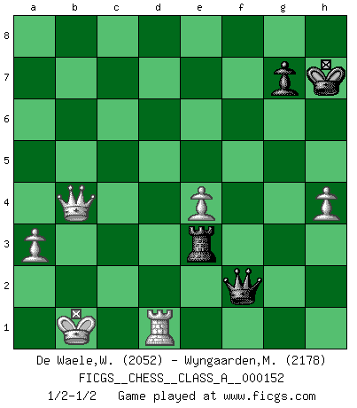 Last move : 1/2-1/2 2014 September 10 18:45:40 [Event "FICGS__CHESS__CLASS_A__000152"] [Site "FICGS"] [Date "2014.06.04"] [Round "1"] [White "De Waele,Willy"] [Black "Wyngaarden,Martin"] [Result "1/2-1/2"] [WhiteElo "2052"] [BlackElo "2178"] 1.e4 c5 2.Nf3 d6 3.d4 cxd4 4.Nxd4 Nf6 5.Nc3 a6 6.Be3 e5 7.Nb3 Be6 8.f3 Be7 9.Qd2 O-O 10.O-O-O Nbd7 11.g4 b5 12.g5 b4 13.Ne2 Ne8 14.f4 a5 15.f5 a4 16.Nbd4 exd4 17.Nxd4 b3 18.Kb1 bxc2+ 19.Nxc2 Bb3 20.axb3 axb3 21.Na3 Ne5 22.h4 Ra4 23.Bd4 Nf3 24.Qc3 Nxd4 25.Rxd4 Rxd4 26.Qxd4 d5 27.Qxd5 Qb6 28.Bc4 Bxa3 29.bxa3 Nd6 30.g6 hxg6 31.fxg6 Nxc4 32.gxf7+ Rxf7 33.Qxc4 Qf2 34.Qxb3 Kh7 35.Rd1 Rf6 36.Qc3 Rf3 37.Qb4 Re3 1/2-1/2 Sicilian : Najdorf, Byrne (English) attack Kingside Castling by player Black (move 9) Queenside Castling by player White (move 10) 10 pieces endgame at move 34 : White KQRPPP , Black KQRP WHITE : King + 1 Queen 1 Rook 3 Pawns BLACK : King + 1 Queen 1 Rook 1 Pawn This chess game ended in a draw. Follow this game move after move (download)The older I grow, the more I value Pawns. (Keres) Die jungen Leute sollen verstehen, dass sie noch etwas von mir lernen können und müssen. (Viktor Kortschnoi) Una partida de Ajedrez se divide en 3 etapas: la primera cuando piensas que tienes la ventaja, la segunda cuando crees que tienes la ventaja y la tercera... ¡cuando te das cuenta que vas a perder!. (Savielly Tartakower) Vous n'êtes pas toujours obligé de jouer le meilleur coup. Un coup doit être actif, entreprenant, correct et beau ! (David Bronstein) Pretend inferiority and encourage his arrogance. (Sun Tzu)
