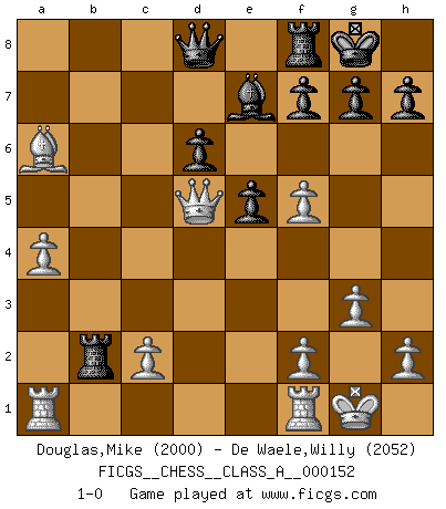 Last move : 1-0 2014 June 11 9:3:54 [Event "FICGS__CHESS__CLASS_A__000152"] [Site "FICGS"] [Date "2014.06.04"] [Round "1"] [White "Douglas,Mike"] [Black "De Waele,Willy"] [Result "1-0"] [WhiteElo "2000"] [BlackElo "2052"] 1.e4 c5 2.Nf3 d6 3.d4 cxd4 4.Nxd4 Nf6 5.Nc3 a6 6.Bg5 e5 7.Nf5 Bxf5 8.Bxf6 Qxf6 9.Nd5 Qd8 10.exf5 Nd7 11.g3 Be7 12.Bg2 Nb6 13.a4 O-O 14.O-O Nxd5 15.Bxd5 Rc8 16.Bxb7 Rb8 17.Bxa6 Rxb2 18.Qd5 1-0 Sicilian : Najdorf, 6.Bg5 Kingside Castling by player Black (move 13) Kingside Castling by player White (move 14) Player White won this chess game. Follow this game move after move (download)Chess is a fairy tale of 1001 blunders. (Savielly Tartakower) Im Schach nämlich geht es darum, daß Ich des Gegners klein zu kriegen, sein Ego zu zerbrechen und zu zermahlen, seine Selbstachtung zu zertreten und zu verscharren und seine ganze mißachtenswerte sogenannte Persönlichkeit ein für alle Mal tot zu hacken und zu zerstampfen und dadurch die menschliche Gesellschaft von einer stinkenden Pestbeule zu befreien. Es ist ein königliches Spiel. (Robert James Fischer) ¿Porque tengo que perder ante este idiota?. (Aron Nimzovich) La conception d'un plan est le processus par lequel un joueur exploite les avantages de sa position tout en s'efforçant d'en réduire au minimum les inconvénients. Afin de garantir le succès, un plan doit toujours se fonder sur un diagnostic objectif des particularités d'une position. La conception d'un plan est d'autant plus difficile que la position est équilibrée, et grandement facilitée lorsqu'il n'existe qu'un seul plan susceptible de répondre aux exigences de la position. (Harry Golombek) Man is still the most extraordinary computer of all. (John F. Kennedy)