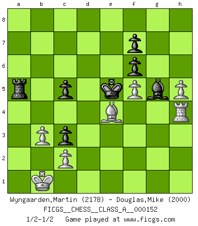 Last move : 1/2-1/2 2014 August 29 0:34:30 [Event "FICGS__CHESS__CLASS_A__000152"] [Site "FICGS"] [Date "2014.06.04"] [Round "1"] [White "Wyngaarden,Martin"] [Black "Douglas,Mike"] [Result "1/2-1/2"] [WhiteElo "2178"] [BlackElo "2000"] 1.e4 c5 2.Nf3 d6 3.d4 cxd4 4.Nxd4 Nf6 5.Nc3 Nc6 6.Bg5 e6 7.Qd2 a6 8.O-O-O Bd7 9.f4 b5 10.Bxf6 gxf6 11.Kb1 Qb6 12.Nxc6 Bxc6 13.f5 h5 14.Qe1 b4 15.Nd5 Bxd5 16.exd5 e5 17.Rd3 Bh6 18.a4 Ke7 19.Qe4 Rhc8 20.Rg3 Qa5 21.b3 Rc3 22.Rxc3 bxc3 23.Qc4 Qc5 24.Qxc5 dxc5 25.a5 Kd6 26.h4 e4 27.Be2 Rg8 28.g3 Bd2 29.Bxh5 Rxg3 30.Be2 Rg8 31.h5 Bh6 32.Bxa6 Ra8 33.Bf1 Rxa5 34.Rh4 Kxd5 35.Bg2 Ke5 36.Bxe4 Bg5 1/2-1/2 Sicilian : Richter-Rauzer, Rauzer attack, 7...a6 Queenside Castling by player White (move 8) This chess game ended in a draw. Follow this game move after move (download)Bobby is the most misunderstood, misquoted celebrity walking the face of this earth. (Yasser Seirawan) Ich hatte Angst gegen einen russischen Großmeister zu verlieren, und er befürchtete gegen einen kleinen Jungen zu verlieren. (über ein Remis gegen Juri Awerbach). (Robert James Fischer) Puntos débiles o agujeros en la posición de tu oponente deben de ser ocupados por piezas, no Peones. (Siegbert Tarrasch) La vie et les Echecs sont tous les deux une lutte constante. (Lasker) Ah, the Socrating method. The best way we have of teaching everything-apart from juggling chainsaws. (Gregory House, House M.D.)