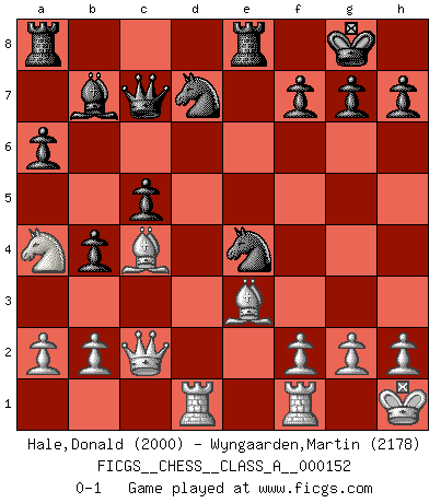 Last move : 0-1 2015 January 19 5:20:1 [Event "FICGS__CHESS__CLASS_A__000152"] [Site "FICGS"] [Date "2014.06.04"] [Round "1"] [White "Hale,Donald"] [Black "Wyngaarden,Martin"] [Result "0-1"] [WhiteElo "2000"] [BlackElo "2178"] 1.d4 d5 2.c4 c6 3.Nc3 Nf6 4.e3 e6 5.Nf3 Nbd7 6.Qc2 Bd6 7.Bd3 O-O 8.O-O dxc4 9.Bxc4 b5 10.Be2 a6 11.e4 e5 12.Bg5 exd4 13.Nxd4 Qc7 14.Kh1 Re8 15.Nf5 b4 16.Nxd6 Qxd6 17.Na4 Nxe4 18.Rad1 Qc7 19.Be3 Bb7 20.Bc4 c5 0-1 This chess game has been lost on time (started : 2014.06.04 0:9:15) QGD Slav defense Kingside Castling by player Black (move 7) Kingside Castling by player White (move 8) Player Black won this chess game. Follow this game move after move (download)During a Chess competition a Chessmaster should be a combination of a beast of prey and a monk. (Alexander Alekhine) Ich glaube, ich kenne inzwischen die Gründe für mein Versagen: schachliche Charakterfehler. Ich war nie ein Wunderkind und in meiner gesamten menschlichen Entwicklung immer zu langsam. (Viktor Kortschnoi) En el tablero, la mentira e hipocresía no sobreviven mucho. (Emanuel Lasker) Les Echecs représentent une sphère d'idées créatrices basée sur la volonté des deux protagonistes. (Smyslov) Big Chess is a place for big hallucinations. (Thibault de Vassal)