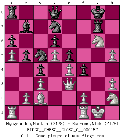 Last move : 0-1 2015 February 3 18:59:17 [Event "FICGS__CHESS__CLASS_A__000152"] [Site "FICGS"] [Date "2014.06.04"] [Round "1"] [White "Wyngaarden,Martin"] [Black "Burrows,Nick"] [Result "0-1"] [WhiteElo "2178"] [BlackElo "2175"] 1.e4 e5 2.Nf3 Nc6 3.Bb5 a6 4.Ba4 Nf6 5.O-O Be7 6.Re1 b5 7.Bb3 d6 8.c3 O-O 9.h3 Nb8 10.d4 Nbd7 11.Nbd2 Bb7 12.Bc2 Re8 13.Nf1 Bf8 14.Ng3 g6 15.a4 c5 16.d5 c4 17.Bg5 h6 18.Be3 Nc5 19.Qd2 h5 20.Bg5 Be7 21.Bh6 Nfd7 22.Qe3 Bf6 23.Nf1 Nb6 24.N1d2 Qc7 25.a5 Nbd7 26.Ng5 Bh8 27.Rf1 f6 28.Ngf3 Kh7 29.Nh4 Rg8 30.Ndf3 Bg7 31.Bxg7 Rxg7 32.Nh2 Kg8 33.g4 Qd8 34.gxh5 f5 35.Nxg6 f4 0-1 This chess game has been lost on time (started : 2014.06.04 0:9:15) Ruy Lopez : Closed Kingside Castling by player White (move 5) Kingside Castling by player Black (move 8) Player Black won this chess game. Follow this game move after move (download)Your body has to be in top condition. Your Chess deteriorates as your body does. You can't separate body from mind. (Bobby Fischer) Ich las kürzlich ein Buch von Nietzsche. Er sagte Religion verdumme nur die Menschen. Ich stimme zu. (Robert James Fischer) El Ajedrez es una hermosa aventura. (Bent Larsen) Les Cavaliers se révèlent fort utiles dans les positions fermées. D'habitude, les Fous sont un peu plus forts que les Cavaliers dans les positions ouvertes. Qu'on le veuille ou non, il restera toujours des exceptions ! I feel so... helpless. (C-3PO in Star Wars ep.3)