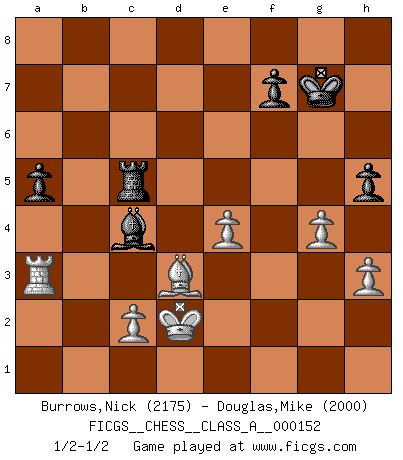 Last move : 1/2-1/2 2014 July 16 0:59:44 [Event "FICGS__CHESS__CLASS_A__000152"] [Site "FICGS"] [Date "2014.06.04"] [Round "1"] [White "Burrows,Nick"] [Black "Douglas,Mike"] [Result "1/2-1/2"] [WhiteElo "2175"] [BlackElo "2000"] 1.e4 c5 2.Nf3 d6 3.d4 cxd4 4.Nxd4 Nf6 5.Nc3 Nc6 6.Bg5 e6 7.Qd2 a6 8.O-O-O Bd7 9.f4 b5 10.Bxf6 gxf6 11.Kb1 Rc8 12.Nxc6 Rxc6 13.Bd3 Rc5 14.f5 Bg7 15.g4 O-O 16.Ne2 Kh8 17.Ng3 Rg8 18.Nh5 Bf8 19.fxe6 Bxe6 20.h3 Be7 21.Rhf1 a5 22.Rf4 R8g5 23.Qf2 Rg6 24.b3 Re5 25.Rf1 b4 26.Rf3 Kg8 27.Nf4 R6g5 28.Qd4 Qa8 29.Nh5 Rg6 30.Rxf6 Rxf6 31.Nxf6+ Bxf6 32.Rxf6 Qd8 33.Rf1 Qc7 34.Kb2 Qc5 35.Qxc5 dxc5 36.Rh1 Kg7 37.Kc1 c4 38.bxc4 Rc5 39.a3 bxa3 40.Kd2 Bxc4 41.Ra1 h5 42.Rxa3 1/2-1/2 Sicilian : Richter-Rauzer, Rauzer attack, 7...a6 Queenside Castling by player White (move 8) Kingside Castling by player Black (move 15) This chess game ended in a draw. Follow this game move after move (download)If your opponent offers you a draw, try to work out why he thinks he's worse off. (Nigel Short) Ich habe die Schachforschung dermaßen betrieben, dass sie auf eine wissenschaftliche Basis gestellt wurde. (Mikhail Moiseyevich Botvinik) Debes de llevar a tu oponente hacia un profundo y obscuro bosque donde 2+2=5, y el camino que conduce a la salida es suficientemente ancho para solamente uno. (Mikhail Tal) Nous sommes les pions de la mystérieuse partie d'Echecs jouée par Dieu. Il nous déplace, nous arrête, nous pousse encore, puis nous lance un à un dans la boîte du Néant. Epitaphe sur la tombe de David Janowsky (1868-1927). But they are useless. They can only give you answers. (Pablo Picasso, about computers)