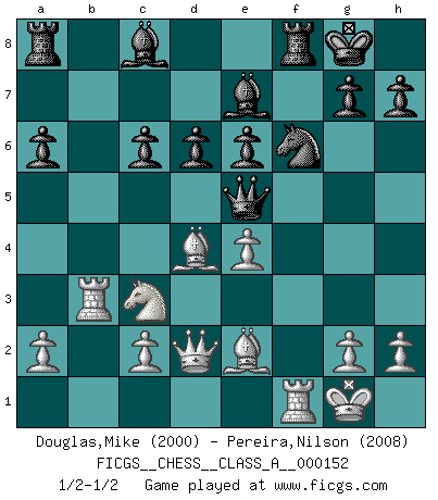 Last move : 1/2-1/2 2014 June 23 4:9:59 [Event "FICGS__CHESS__CLASS_A__000152"] [Site "FICGS"] [Date "2014.06.04"] [Round "1"] [White "Douglas,Mike"] [Black "Pereira,Nilson"] [Result "1/2-1/2"] [WhiteElo "2000"] [BlackElo "2008"] 1.e4 c5 2.Nf3 d6 3.d4 cxd4 4.Nxd4 Nf6 5.Nc3 a6 6.Bg5 e6 7.f4 Qb6 8.Qd2 Qxb2 9.Rb1 Qa3 10.f5 Nc6 11.fxe6 fxe6 12.Nxc6 bxc6 13.Be2 Be7 14.O-O O-O 15.Rb3 Qc5+ 16.Be3 Qe5 17.Bd4 Qa5 18.Bb6 Qe5 19.Bd4 Qa5 20.Bb6 Qe5 21.Bd4 1/2-1/2 Sicilian : Najdorf, 7...Qb6 Kingside Castling by player White (move 14) Kingside Castling by player Black (move 14) This chess game ended in a draw. Follow this game move after move (download)By the beauty of his games, the clarity of his play, and the brilliance of his ideas, Fischer made himself an artist of the same stature as Brahms, Rembrandt, and Shakespeare. (David Levy) Pläne sind die Träume des Verständigen. (Ernst Freiherr von Feuchtersleben) Nunca antes ha habido un jugador de Ajedrez con tal conocimiento a fondo de las complejidades del juego y una inmensa voluntad absolutamente indomable de ganar. Yo pienso que Fischer es el jugador mas grande que jamás haya existido. (Lisa Lane) Je crois qu'il existe des manières très spécifiques de jouer efficacement contre une machine. Evidemment, nous n'avons aucune chance en technique pure, parce que l'ordinateur calcule de manière parfaite. Mais lorsque nous faisons appel à notre cerveau, en utilisant l'intuition et la compréhension, alors nous restons beaucoup plus forts. (Anatoli Karpov) He who laughs last probably does not get the joke. (Unknown)