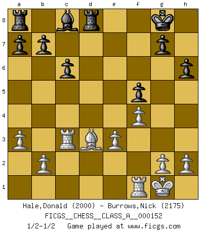 Last move : 1/2-1/2 2014 July 23 20:41:52 [Event "FICGS__CHESS__CLASS_A__000152"] [Site "FICGS"] [Date "2014.06.04"] [Round "1"] [White "Hale,Donald"] [Black "Burrows,Nick"] [Result "1/2-1/2"] [WhiteElo "2000"] [BlackElo "2175"] 1.d4 d5 2.c4 e6 3.Nc3 Be7 4.Nf3 Nf6 5.Bg5 O-O 6.e3 h6 7.Bh4 Ne4 8.Bxe7 Qxe7 9.Rc1 Nxc3 10.Rxc3 c6 11.Bd3 Nd7 12.O-O e5 13.dxe5 dxc4 14.Bxc4 Nxe5 15.Nxe5 Qxe5 16.f4 Qe4 17.Qd3 Qxd3 18.Bxd3 Rd8 19.a3 f5 1/2-1/2 QGD : Charousek (Petrosian) variation Kingside Castling by player Black (move 5) Kingside Castling by player White (move 12) This chess game ended in a draw. Follow this game move after move (download)Of Chess it has been said that life is not long enough for it, but that is the fault of life, not Chess. (William Ewart Napier) Schach ist ein Reich, wo sich die menschliche Phantasie frei entfalten kann. (David Bronstein) El Ajedrez demanda una total concentración. (Bobby Fischer) Le succès, c'est être capable d'aller d'échec en échec sans perdre son enthousiasme. (Winston Churchill) Good decisions come from experience, and experience comes from bad decisions. (Anonymous)