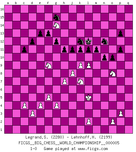 Last move : 1-0 2015 October 27 0:7:40 [Event "FICGS__BIG_CHESS__WORLD_CHAMPIONSHIP__000005"] [Site "FICGS"] [Date "2014.06.08"] [Round "1"] [White "Legrand,Stephane"] [Black "Lehnhoff,Heinz-Georg"] [Result "1-0"] [WhiteElo "2280"] [BlackElo "2199"] 1.m2-m4 m15-m13 2.p1-o3 e15-e13 3.b1-c3 j15-k13 4.e2-e4 d15-d13 5.j2-k4 h15-g13 6.l1-p5 k16-h15 7.f1-b5 h16-o10 8.h2-g4 g16-j15 9.d2-d3 f16-b12 10.h1-l4 c15-c13 11.p5-l9 b16-c14 12.c1-h6 c16-d15 13.e1-e3 n15-n13 14.e3-f3 f15-f14 15.a1-e1 c14-d12 16.l4-l6 l16-p12 17.n2-n4 d15-c14 18.k1-h2 o15-o13 19.f3-f5 p16-o14 20.e1-e3 d12-e14 21.o1-j6 d13-d12 22.l6-n6 o16-m14 23.m4-m5 b12-h6 24.l9-h6 a15-a13 25.b5-f9 p12-j6 26.n6-j6 e14-c15 27.e3-f3 b15-b13 28.f9-h7 o14-n12 29.h7-j8 c15-d13 30.m5-m6 c13-c12 31.m1-m5 p15-p14 32.q1-m1 m13-m12 33.m5-q5 j15-l14 34.m1-m5 j16-j15 35.f5-f10 o10-p9 36.m5-p5 p9-g9 37.k4-m3 e16-d16 38.g1-e2 c14-e16 39.q5-q7 m14-j11 40.p5-b5 a16-a15 41.f10-q10 m16-m15 42.j8-l10 e16-l10 43.q10-l10 d13-c11 44.l10-j10 j11-n15 45.f3-f9 g9-g12 46.f9-j9 h15-j13 47.j10-q10 n12-o14 48.j6-k6 q15-q13 49.h6-c11 o14-p12 50.q10-q9 b13-b12 51.c11-m2 q16-p16 52.j9-a9 d16-a16 53.q7-a7 c12-c11 54.b5-b12 m15-m16 55.b12-a12 m16-b16 56.q9-b9 g12-e12 57.b9-b16 p16-b16 58.b2-b3 e12-n4 59.a12-a13 a15-a13 60.a9-a13 a16-a13 61.a7-a13 j13-h15 62.m2-n3 h15-k14 63.h2-j4 k14-h13 64.k6-l7 b16-b10 65.j4-l3 n4-p6 66.o3-n1 n15-h10 67.l7-l12 p12-n11 68.l12-p16 j15-k14 69.a13-a6 h10-m14 70.m3-o4 p6-p8 71.n1-m3 b10-p10 72.p16-f7 p8-k8 73.n3-j7 k8-k9 74.j7-f10 k14-j15 75.a6-a16 g13-h15 76.f10-c7 l14-j13 77.a16-a5 k9-j8 78.c7-f4 n11-l12 79.f7-j4 j8-g10 80.j1-h2 n13-n12 81.a5-a6 p10-j10 82.a6-j6 j10-p10 83.a2-a4 p10-p11 84.f4-g3 p11-o11 85.j6-j10 g10-c6 86.m6-m7 l12-n13 87.j4-f7 o11-m11 88.m7-m8 j13-h11 89.j10-a10 h11-j13 90.a4-a5 l15-l14 91.b3-b4 m14-b4 92.a10-a16 b4-m14 93.a5-a6 c6-l6 94.f7-p16 h15-k16 95.a16-a8 m11-h11 96.p16-f7 l6-c6 97.f7-e8 c6-j6 98.e8-g8 j6-k7 99.g4-j5 k7-h5 100.j5-k3 j15-k14 101.a6-a7 h5-c10 102.g8-e8 c10-c9 103.h2-j2 h11-g11 104.l3-j4 g11-g7 105.e8-b8 c9-c6 106.a8-a9 c6-a6 107.b8-b5 a6-a1 108.k3-j1 g7-a7 109.a9-a7 a1-a7 110.c3-d5 a7-c9 111.c2-c4 c9-q9 112.j2-h2 q9-q2 113.e2-f4 q2-q7 114.b5-b6 k14-j15 115.b6-c7 q7-n10 116.p2-p3 k16-h15 117.o4-m5 j13-l12 118.m5-k6 h15-j13 119.k6-m7 m14-j11 120.m7-k8 n10-m10 121.k8-l6 m10-g10 122.l6-j7 j11-h12 123.c7-e7 h12-j11 124.e7-f7 g10-j8 125.j4-h6 j8-m11 126.f7-g8 j11-k12 127.h6-k7 m11-q7 128.g8-j6 q7-n10 129.k7-h8 n10-f10 130.f4-g6 f10-l10 131.j7-g8 k12-m14 132.g8-j9 l10-m11 133.j9-k7 m11-l10 134.k7-l9 k13-l11 135.g6-j5 l11-k13 136.j5-k7 j13-k11 137.g3-d6 m14-d6 138.j6-d6 k11-l9 139.m8-l9 k13-j11 140.d5-f4 n13-m11 141.d6-g9 l14-l13 142.j1-k3 k15-k13 143.k3-l5 l10-n8 144.h8-j10 n8-e8 145.g9-f10 j14-j13 146.m3-k4 e8-l8 147.j10-g11 m11-k12 148.g11-h13 j11-h13 149.f10-q10 k12-m13 150.q10-p11 l8-p12 151.p11-p12 q13-p12 152.l5-m7 h13-g11 153.h3-h4 l12-j11 154.j3-j4 l13-l12 155.j4-j5 m12-m11 156.k4-m5 n12-n11 157.h2-j3 j15-k14 158.m5-l7 o13-o12 159.j3-k4 k14-l13 160.k4-l5 g11-h9 161.k7-h8 k13-k12 162.l7-k9 l12-l11 163.f4-g6 j11-h13 164.g6-j7 h9-g7 165.g2-g3 g7-e6 166.j7-g6 e6-c5 167.g6-e5 c5-e6 168.k9-h10 e6-g7 169.m7-k6 o12-o11 170.f2-f4 n11-n10 171.f4-f5 l13-l12 172.g3-g4 g7-h9 173.h4-h5 p14-p13 174.h5-h6 h9-k8 175.j5-j6 k8-l10 176.k2-k4 m13-k14 177.k4-k5 j13-j12 178.k6-m7 h13-g11 179.k5-k6 h14-h13 180.k6-k7 g15-g13 181.j6-j7 j12-j11 182.h10-f9 g11-j12 183.k7-k8 h13-h12 184.h8-k7 k12-k11 185.k8-k9 l10-k12 186.h6-h7 f14-f13 187.e5-f7 g13-g12 188.f7-e9 k14-h13 189.k7-m6 o11-o10 190.m7-o8 j12-l13 191.j7-j8 l13-n12 192.m6-k7 p12-p11 193.e9-g10 h12-h11 194.g10-h12 h13-g15 195.h12-g14 1-0 Follow this game move after move (download)We must make sure that Chess will not be like a dead language, very interesting, but for a very small group. (Sytze Faber) Sie bekommen vielleicht den Eindruck, dass die Spitzenspieler überhaupt gar nicht so stark sind. Aber das stimmt nicht. Es ist eine Illusion. Mit einem Computer an der Seite ist es sehr leicht, Urteile zu fällen, aber wenn man alleine am Brett sitzt, sieht die Sache ganz anders aus. (Vladimir Kramnik) Bobby Fischer es el jugador de Ajedrez mas grande que jamás haya existido. (Ken Smith) La conception d'un plan est le processus par lequel un joueur exploite les avantages de sa position tout en s'efforçant d'en réduire au minimum les inconvénients. Afin de garantir le succès, un plan doit toujours se fonder sur un diagnostic objectif des particularités d'une position. La conception d'un plan est d'autant plus difficile que la position est équilibrée, et grandement facilitée lorsqu'il n'existe qu'un seul plan susceptible de répondre aux exigences de la position. (Harry Golombek) Creativity involves breaking out of established patterns in order to look at things in a different way. (Edward De Bono)