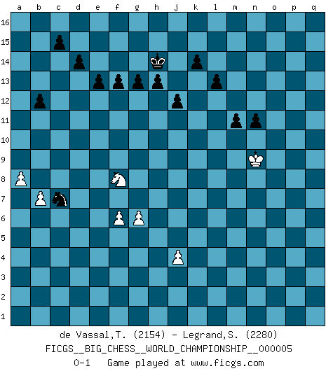 Last move : 0-1 2015 September 4 23:21:56 [Event "FICGS__BIG_CHESS__WORLD_CHAMPIONSHIP__000005"] [Site "FICGS"] [Date "2014.06.08"] [Round "1"] [White "de Vassal,Thibault"] [Black "Legrand,Stephane"] [Result "0-1"] [WhiteElo "2154"] [BlackElo "2280"] 1.j2-k4 p16-o14 2.h1-o7 h15-g13 3.o7-c7 j15-k13 4.h2-g4 b16-c14 5.m2-m4 e15-e13 6.n2-n4 f16-b12 7.g1-j2 m15-m13 8.p1-o3 l16-p12 9.k1-h2 n15-n14 10.l1-p5 k16-h15 11.e2-e4 d15-d14 12.b1-c3 o16-f8 13.o1-j6 p12-o13 14.f1-b5 h16-l13 15.d2-d3 g16-j15 16.c1-l9 m13-m12 17.m1-m3 q15-q13 18.m3-l3 k13-l11 19.e1-e3 b12-e9 20.c7-b7 a15-a13 21.e3-f3 e9-b12 22.q2-q4 o13-p12 23.l3-l6 j15-k13 24.a2-a4 l13-k12 25.b7-o7 c16-g12 26.j6-p12 q13-p12 27.c3-d5 g12-f11 28.l6-n6 m16-m13 29.a1-e1 k12-e12 30.k4-m5 e12-c10 31.j2-k4 j16-j15 32.c2-c4 q16-q11 33.o7-p8 f11-g12 34.n6-j6 f8-d10 35.b2-b4 e16-q16 36.f3-f6 q11-q8 37.p8-p6 g12-e10 38.j6-n6 q8-j8 39.h2-j4 e10-h13 40.p6-p7 c10-d11 41.b5-f9 d11-b9 42.m5-k6 j8-f8 43.f6-f8 d10-f8 44.f9-b5 q16-q9 45.n6-n9 a16-q16 46.l9-m10 q9-n9 47.p7-n9 b9-c10 48.q1-n1 m13-q13 49.m10-h6 f8-h6 50.j4-h6 c10-f10 51.k6-j8 q13-q9 52.n9-j5 f10-j10 53.o3-n5 q9-j9 54.p5-k10 j9-k9 55.k4-j6 k9-o9 56.o2-o3 g13-j12 57.k10-g7 q16-q4 58.g7-b12 a13-b12 59.j5-m8 o9-q9 60.l2-l3 q4-q2 61.p2-p4 j12-h10 62.j6-l7 h10-j8 63.l7-j8 j10-k11 64.j8-k6 l11-k9 65.m8-m6 q9-q6 66.m6-k4 k9-j7 67.k6-l4 k11-l11 68.j1-j2 j7-l6 69.k4-j4 l6-n5 70.l4-n5 l11-l3 71.e1-k1 q6-k6 72.h6-k5 l3-g7 73.n5-l4 k6-k9 74.n1-q1 q2-q1 75.k1-q1 h13-d9 76.j4-j6 g7-o7 77.q1-l1 o7-o3 78.l4-m6 o3-k3 79.j2-j1 l15-l14 80.l1-q1 k9-q9 81.q1-q9 k3-q9 82.j6-b13 q9-k9 83.b13-b15 k9-d15 84.b15-b13 d9-f11 85.b13-f9 h15-g13 86.f9-p9 d15-m7 87.p9-p6 f11-g12 88.p4-p5 m7-l6 89.k5-l3 g12-h13 90.p6-o6 k13-l11 91.m4-m5 l6-k6 92.c4-c5 c14-d12 93.p5-p6 k6-p1 94.j1-h2 p1-p6 95.o6-p6 h13-p6 96.b5-g10 p6-j12 97.g10-j12 g13-j12 98.a4-a5 o14-m13 99.b4-b5 o15-o13 100.a5-a6 j12-g11 101.d5-e7 h14-h13 102.b5-b6 g11-e10 103.d3-d4 e10-f8 104.c5-c6 l11-j10 105.d4-d5 j10-h8 106.a6-a7 o13-o12 107.g4-h6 p12-p11 108.l3-k5 n14-n13 109.k5-l7 n13-n12 110.l7-n8 l14-l13 111.h6-j8 m13-l11 112.j8-l9 k15-k14 113.n8-p9 o12-o11 114.m6-n8 h8-k9 115.l9-k11 j14-j13 116.n8-m10 g15-g13 117.e7-f9 j13-j12 118.m10-k9 l11-k9 119.f9-h10 k9-h10 120.k11-h10 f15-f13 121.p9-q11 n12-n11 122.q11-o12 p11-p10 123.h10-j8 f8-h7 124.j8-k10 p10-p9 125.o12-n14 h7-j5 126.n14-p15 j5-k3 127.h2-j2 k3-l5 128.n4-n5 l5-m3 129.n5-n6 m3-o4 130.p15-q13 o4-m5 131.q13-o12 m5-l7 132.n6-n7 l7-m5 133.k10-l8 d12-f11 134.n7-n8 o11-o10 135.o12-q11 p9-p8 136.n8-n9 o10-o9 137.n9-n10 f11-h10 138.j2-k3 h10-k9 139.k3-l4 m5-o6 140.q11-p9 k9-m8 141.a7-a8 o6-q7 142.p9-q7 p8-q7 143.l8-n7 o9-o8 144.n7-p8 m8-n10 145.l4-m5 n10-m8 146.p8-o6 q7-q6 147.m5-n5 j15-h14 148.n5-o5 m8-l6 149.o5-p6 l6-n5 150.p6-q6 n5-l4 151.q6-p6 l4-k2 152.f2-f3 k2-h1 153.j3-j4 h1-g3 154.p6-o7 g3-e2 155.h3-h4 e2-f4 156.g2-g4 f4-g6 157.o7-o8 g6-h4 158.f3-f4 h4-g6 159.f4-f5 g6-j5 160.g4-g5 j5-h7 161.g5-g6 h7-f6 162.o6-m7 f6-e4 163.m7-k6 e4-c3 164.d5-d6 c3-b5 165.k6-h7 b5-d6 166.f5-f6 d6-c8 167.b6-b7 c8-a7 168.c6-c7 a7-b5 169.h7-f8 b5-c7 170.o8-n9 m12-m11 0-1 Follow this game move after move (download)Whoever sees no other aim in the game than that of giving checkmate to one's opponent will never become a good Chess player. (Euwe) Ich war schon mal beim Dopingtest. Da musste ich Urin abgeben, während Dritte zusahen. (Elisabeth Pähtz) Fischer deseaba darle a los Rusos una sopa de su propia medicina. (Larry Evans) Le moment que je préfère le plus dans une rencontre, c'est celui où je sens que la personnalité de l'adversaire se brise. (Robert Fischer) It's not the size of the dog in the fight, it's the size of the fight in the dog. (Mark Twain)