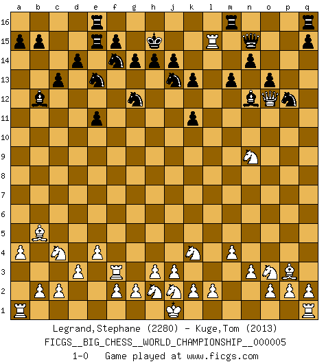 Last move : 1-0 2014 August 22 22:50:29 [Event "FICGS__BIG_CHESS__WORLD_CHAMPIONSHIP__000005"] [Site "FICGS"] [Date "2014.06.08"] [Round "1"] [White "Legrand,Stephane"] [Black "Kuge,Tom"] [Result "1-0"] [WhiteElo "2280"] [BlackElo "2013"] 1.m2-m4 m15-m13 2.p1-o3 b16-c14 3.b1-c3 l16-o13 4.e2-e4 n15-n14 5.j2-k4 j15-h13 6.f1-b5 p16-o14 7.h2-g4 k16-l14 8.l1-o4 e15-e13 9.n2-n3 f16-b12 10.d2-d3 d15-d14 11.o1-f9 h15-j13 12.h1-l4 h16-l13 13.l4-k3 g16-f14 14.c1-k8 l13-p9 15.o4-p3 c16-k9 16.k1-h2 o16-f8 17.g1-j2 e13-e12 18.e1-e3 l14-k12 19.m1-m3 l15-l13 20.m3-l3 l13-l12 21.e3-f3 k12-j10 22.k8-e3 j10-h8 23.f9-m3 h13-j11 24.a2-a4 o13-m11 25.k3-h5 h8-j10 26.e3-h6 f8-h6 27.g4-h6 j11-g12 28.h6-g8 e12-e11 29.g8-j7 k9-l10 30.h5-c10 j16-j15 31.c10-j10 p9-g9 32.j10-j9 g9-b4 33.c3-d5 b4-d2 34.d5-e3 d2-b4 35.e3-c4 c14-e13 36.j9-p9 j15-h15 37.p9-p15 b4-n15 38.p15-q14 o14-p12 39.q14-l9 c15-c13 40.j7-l8 m11-n12 41.m3-n4 e16-e15 42.n4-e12 g15-g14 43.e12-g10 a16-e16 44.l8-n9 l10-k11 45.g10-j12 k15-k13 46.j12-k11 l12-k11 47.l9-o12 o15-o13 48.l3-l15 1-0 Follow this game move after move (download)I'm not a materialistic person, in that, I don't suffer the lack or loss of money. The absence of worldly goods I don't look back on. For Chess is a way I can be as materialistic as I want without having to sell my soul. (Jamie Walter Adams) Wenn ich einen Club besuche, sind die Spieler stumm vor Staunen. (José Raúl Capablanca) El Ajedrez es una hermosa aventura. (Bent Larsen) Des points faibles ou des trous dans la position de l'adversaire doivent être occupés par des pièces et non pas par des pions. (Siegbert Tarrasch) All politicians must be presumed guilty until they are proven innocent. (Dinesh De Silva)