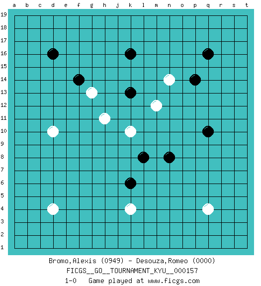 Last move : 1-0 2014 August 11 16:24:26 [Event "FICGS__GO__TOURNAMENT_KYU__000157"] [Site "FICGS"] [Date "2014.06.11"] [Round "1"] [Black "Bromo,Alexis"] [White "Desouza,Romeo"] [Result "1-0"] [Rating 1 "0949"] [Rating 2 "0000"] 1.d16 q4 2.q16 d4 3.q10 d10 4.k16 k10 5.n8 m12 6.k13 g13 7.f14 h11 8.l8 n14 9.p14 k4 10.k6 1-0 This go game has been lost on time (started : 2014.06.11 9:59:51) Here are the names of the openings (joseki) played in the four corners : Corner q4 : q4 n8 Hoshi (Hwajeom, Seongjeom, Xingwei`) 4-4 Point. The star or hoshi (4-4) point, emphasizing influence at the potential expense of territory. Corner q16 : q16 m12 Hoshi (Hwajeom, Seongjeom, Xingwei`) 4-4 Point. The star or hoshi (4-4) point, emphasizing influence at the potential expense of territory. Corner d16 : d16 g13 Hoshi (Hwajeom, Seongjeom, Xingwei`) 4-4 Point. The star or hoshi (4-4) point, emphasizing influence at the potential expense of territory. Player Black won this Go (weiqi, baduk) game. Follow this game move after move (download)Big groups never die. (Anonymous) Without deviation from the norm, progress is not possible. (Frank Zappa)