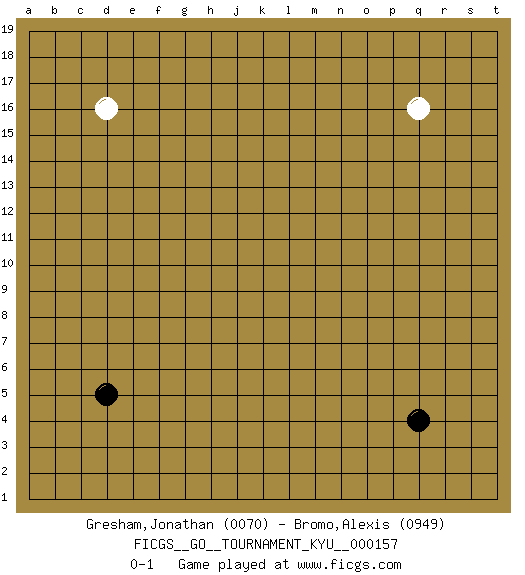 Last move : 0-1 2014 July 23 1:32:14 [Event "FICGS__GO__TOURNAMENT_KYU__000157"] [Site "FICGS"] [Date "2014.06.11"] [Round "1"] [Black "Gresham,Jonathan"] [White "Bromo,Alexis"] [Result "0-1"] [Rating 1 "0070"] [Rating 2 "0949"] 1.q4 d16 2.d5 q16 0-1 This go game has been lost on time (started : 2014.06.11 9:59:51) Here are the names of the openings (joseki) played in the four corners : Player White won this Go (weiqi, baduk) game. Follow this game move after move (download)Every move brings change. (Pierre Audouard) Follow your passion, and success will follow you. (Arthur Buddhold)