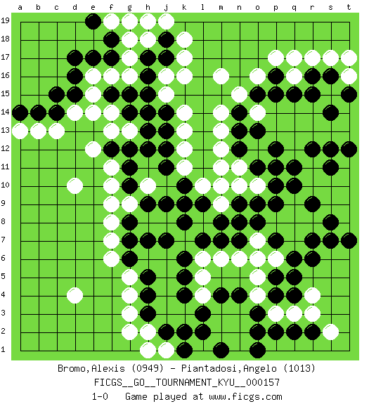 Last move : 1-0 2015 January 20 1:50:55 [Event "FICGS__GO__TOURNAMENT_KYU__000157"] [Site "FICGS"] [Date "2014.06.11"] [Round "1"] [Black "Bromo,Alexis"] [White "Piantadosi,Angelo"] [Result "1-0"] [Rating 1 "0949"] [Rating 2 "1013"] 1.d16 d4 2.q4 q16 3.k10 d10 4.k4 k16 5.q10 g3 6.h5 g5 7.g6 f6 8.g7 f9 9.g10 g9 10.h9 f10 11.g11 f13 12.g14 g13 13.h13 f14 14.f15 e15 15.g15 e16 16.e17 f16 17.f17 g16 18.h15 k14 19.j13 k13 20.j14 j15 21.h16 e14 22.d15 d14 23.c14 g17 24.h17 g18 25.d17 h18 26.j17 k17 27.j18 k18 28.h12 f11 29.g12 m11 30.n12 n11 31.o11 o10 32.p10 p8 33.o9 n10 34.n9 m9 35.n8 o7 36.n7 n6 37.m7 m6 38.l7 l6 39.k6 l5 40.k5 l4 41.l3 m3 42.l2 m2 43.p4 o4 44.o3 n3 45.o2 o5 46.p5 p6 47.q6 q7 48.r6 r10 49.q11 r11 50.r12 q9 51.p9 m12 52.n13 m13 53.n14 n15 54.o15 o16 55.p15 m16 56.p16 p17 57.q15 q17 58.r16 r17 59.s16 s17 60.r15 o12 61.p11 o14 62.o13 m14 63.p12 f7 64.g8 f8 65.h4 g4 66.h3 h2 67.j2 g2 68.r7 r8 69.s8 s9 70.s7 t8 71.t7 t9 72.s11 s10 73.s12 t16 74.t15 k11 75.j11 k12 76.j12 l10 77.k9 h8 78.h7 c13 79.b14 b13 80.a14 a13 81.c15 j19 82.f18 f19 83.e19 g19 84.l9 j16 85.h14 h10 86.j9 j8 87.j7 j1 88.k1 h1 89.k2 t17 90.s14 t11 91.t12 t10 92.r9 q8 93.o8 o6 94.p7 l8 95.k8 m10 96.m8 n2 97.o1 h19 98.f12 e12 99.n4 n1 100.m4 p3 101.p2 q3 102.q2 r3 103.r2 r4 104.q5 s2 105.m1 1-0 Here are the names of the openings (joseki) played in the four corners : Corner q4 : q4 p8 Hoshi (Hwajeom, Seongjeom, Xingwei`) 4-4 Point. The star or hoshi (4-4) point, emphasizing influence at the potential expense of territory. Player Black won this Go (weiqi, baduk) game. Follow this game move after move (download)Don't make a play adjacent to a cutting-point. (Anonymous) There are lots of people who mistake their imagination for their memory. (Josh Bilings)