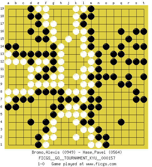 Last move : 1-0 2014 December 1 22:11:9 [Event "FICGS__GO__TOURNAMENT_KYU__000157"] [Site "FICGS"] [Date "2014.06.11"] [Round "1"] [Black "Bromo,Alexis"] [White "Hase,Pavel"] [Result "1-0"] [Rating 1 "0949"] [Rating 2 "0564"] 1.q16 k16 2.d4 k10 3.q4 d10 4.m8 l9 5.k7 k8 6.h8 h9 7.d16 j15 8.m14 l11 9.n12 m12 10.n13 l13 11.m10 m11 12.n11 m9 13.n9 l7 14.m7 k6 15.j7 j8 16.h7 m6 17.n7 l8 18.n6 l5 19.m5 j5 20.g6 h5 21.g5 g4 22.f4 g3 23.l4 k4 24.l6 k5 25.m6 l3 26.m4 m3 27.n3 m2 28.n2 n1 29.o1 m1 30.o2 k2 31.f3 f2 32.e2 f1 33.e1 g2 34.f8 g9 35.g8 e9 36.e8 d8 37.d7 c8 38.c7 b8 39.b7 a7 40.a6 a8 41.b6 l14 42.m15 l15 43.m16 l16 44.l17 k17 45.l18 k18 46.e15 l19 47.m19 k19 48.m18 m13 49.d13 l10 50.n10 f9 51.g14 d11 52.d12 e12 53.e13 f12 54.f13 h14 55.g13 h12 56.g12 e11 57.g11 g15 58.f15 g16 59.f16 f17 60.e17 f18 61.e18 e19 62.d19 f19 63.d18 c12 64.c13 b12 65.b13 a13 66.a14 a12 67.b14 h13 68.f11 h11 69.f10 g10 70.e10 h10 71.h6 q10 72.r10 r11 73.r9 p11 74.p12 q12 75.q13 r13 76.q14 r14 77.r15 s15 78.s16 t15 79.t16 s10 80.q9 q11 81.p10 o11 82.o10 o12 83.p13 o13 84.o14 s9 85.s8 t8 86.s7 t9 87.t7 j6 88.s14 s13 89.t14 t13 90.pass d9 91.s12 s11 92.t12 t11 93.r12 g17 94.t10 1-0 Here are the names of the openings (joseki) played in the four corners : Corner d16 : d16 j15 Hoshi (Hwajeom, Seongjeom, Xingwei`) 4-4 Point. The star or hoshi (4-4) point, emphasizing influence at the potential expense of territory. Player Black won this Go (weiqi, baduk) game. Follow this game move after move (download)The rectangular six is normally alive. (Anonymous) It is the aim of the modern school, not to treat every position according to one general law, but according to the principle inherent in the position. (Richard Reti)