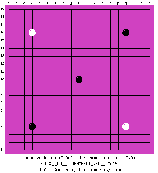 Last move : 1-0 2014 July 20 13:23:59 [Event "FICGS__GO__TOURNAMENT_KYU__000157"] [Site "FICGS"] [Date "2014.06.11"] [Round "1"] [Black "Desouza,Romeo"] [White "Gresham,Jonathan"] [Result "1-0"] [Rating 1 "0000"] [Rating 2 "0070"] 1.d4 d16 2.q16 q4 3.k10 1-0 This go game has been lost on time (started : 2014.06.11 9:59:51) Here are the names of the openings (joseki) played in the four corners : Player Black won this Go (weiqi, baduk) game. Follow this game move after move (download)If there is no stone on the handicap point, the carpenter's square is dead. (Anonymous) Hold em is to stud what chess is to checkers. (Johnny Moss)