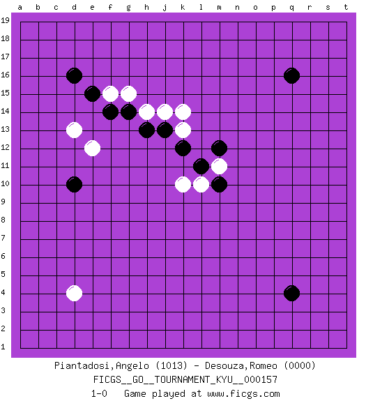 Last move : 1-0 2014 July 31 2:30:34 [Event "FICGS__GO__TOURNAMENT_KYU__000157"] [Site "FICGS"] [Date "2014.06.11"] [Round "1"] [Black "Piantadosi,Angelo"] [White "Desouza,Romeo"] [Result "1-0"] [Rating 1 "1013"] [Rating 2 "0000"] 1.q16 d4 2.q4 k10 3.d16 f15 4.e15 d13 5.d10 e12 6.f14 g15 7.g14 h14 8.h13 j14 9.j13 k14 10.m12 k13 11.k12 m11 12.l11 l10 13.m10 1-0 This go game has been lost on time (started : 2014.06.11 9:59:51) Here are the names of the openings (joseki) played in the four corners : Corner d16 : d16 f15 Hoshi (Hwajeom, Seongjeom, Xingwei`) 4-4 Point. The star or hoshi (4-4) point, emphasizing influence at the potential expense of territory. Corner q4 : q4 1-0 Hoshi (Hwajeom, Seongjeom, Xingwei`) 4-4 Point. The star or hoshi (4-4) point, emphasizing influence at the potential expense of territory. Player Black won this Go (weiqi, baduk) game. Follow this game move after move (download)Ikken tobi is never wrong. (Anonymous) Luck is what you have left over after you give 100 percent. (Langston Coleman)