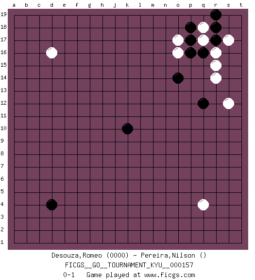 Last move : 0-1 2014 July 31 2:30:34 [Event "FICGS__GO__TOURNAMENT_KYU__000157"] [Site "FICGS"] [Date "2014.06.11"] [Round "1"] [Black "Desouza,Romeo"] [White "Pereira,Nilson"] [Result "0-1"] [Rating 1 "0000"] 1.d4 d16 2.q16 q4 3.k10 r14 4.o14 o17 5.q12 r16 6.r18 q17 7.p16 q18 8.r17 r15 9.r19 s12 10.p17 s17 11.p18 o16 0-1 This go game has been lost on time (started : 2014.06.11 9:59:51) Here are the names of the openings (joseki) played in the four corners : Corner q16 : q16 r14 Hoshi (Hwajeom, Seongjeom, Xingwei`) 4-4 Point. The star or hoshi (4-4) point, emphasizing influence at the potential expense of territory. Ikken Kakari (Hankan Keolch'im, Yi Gua`jiao~, 1-Space Low Approach). White 2 is the standard approach move to the 4-4. Corner q4 : q4 0-1 Hoshi (Hwajeom, Seongjeom, Xingwei`) 4-4 Point. The star or hoshi (4-4) point, emphasizing influence at the potential expense of territory. Player White won this Go (weiqi, baduk) game. Follow this game move after move (download)Keep away from thickness. (Anonymous) Do you know these so called Volunteers don't even get paid! (Simpsons)