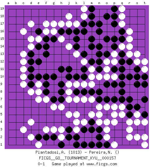 Last move : 0-1 2015 February 6 3:32:46 [Event "FICGS__GO__TOURNAMENT_KYU__000157"] [Site "FICGS"] [Date "2014.06.11"] [Round "1"] [Black "Piantadosi,Angelo"] [White "Pereira,Nilson"] [Result "0-1"] [Rating 1 "1013"] 1.q16 d4 2.q4 d17 3.q10 o3 4.m3 r3 5.q3 r4 6.r5 r2 7.q2 s5 8.r6 s7 9.s6 t6 10.r7 s8 11.s9 r8 12.q8 r9 13.s10 t8 14.q9 t4 15.r10 q5 16.t9 r14 17.p14 q6 18.t7 r16 19.q15 r15 20.k16 q17 21.p17 p5 22.o4 p4 23.n3 o2 24.o5 g3 25.d10 c12 26.e12 d14 27.e14 d15 28.e16 d8 29.f8 j14 30.k14 k13 31.k10 m7 32.p7 k3 33.l5 e9 34.f10 g9 35.f9 g8 36.g7 h10 37.j11 q18 38.p18 l14 39.k15 l15 40.l16 n15 41.n16 m16 42.m17 j5 43.j6 h6 44.t5 o16 45.n17 f7 46.h7 j7 47.h8 j8 48.h9 g6 49.g10 o6 50.o7 n6 51.n7 e7 52.h11 o17 53.o18 l7 54.k6 k7 55.m6 m5 56.l6 l4 57.m4 p6 58.m8 n5 59.l3 e15 60.f15 e13 61.f14 f16 62.f13 g16 63.h16 h17 64.g15 l12 65.n12 h15 66.j16 s4 67.r1 j17 68.m15 l9 69.l10 m9 70.n8 s2 71.p3 k4 72.q7 k5 73.j10 p16 74.o15 c11 75.d13 c10 76.e10 q14 77.p15 p13 78.o13 c13 79.d12 m11 80.m12 k17 81.l17 p12 82.p11 c3 83.n2 o11 84.n11 p10 85.q11 n10 86.n14 m13 87.n13 q19 88.p19 s12 89.o9 m10 90.l11 l18 91.m18 l19 92.p2 n4 93.o1 o4 94.s1 t2 95.k2 p1 96.q1 t1 97.n1 l2 98.l1 p1 99.j2 h2 100.j3 m2 101.m1 j1 102.k1 o10 103.p9 c9 104.d9 e8 105.d11 t11 106.s11 g17 107.m14 s13 108.t10 t12 109.r12 c16 110.l8 f17 111.l13 k9 112.q12 o12 113.k8 r13 114.q13 j9 115.h1 f3 116.g2 h3 117.f2 e1 118.m19 j18 119.e2 d2 0-1 Here are the names of the openings (joseki) played in the four corners : Corner q4 : q4 o3 Hoshi (Hwajeom, Seongjeom, Xingwei`) 4-4 Point. The star or hoshi (4-4) point, emphasizing influence at the potential expense of territory. Ikken Kakari (Hankan Keolch'im, Yi Gua`jiao~, 1-Space Low Approach). White 2 is the standard approach move to the 4-4. Corner q16 : q16 r14 Hoshi (Hwajeom, Seongjeom, Xingwei`) 4-4 Point. The star or hoshi (4-4) point, emphasizing influence at the potential expense of territory. Ikken Kakari (Hankan Keolch'im, Yi Gua`jiao~, 1-Space Low Approach). White 2 is the standard approach move to the 4-4. Player White won this Go (weiqi, baduk) game. Follow this game move after move (download)Attach to the strongest stone in a pincer. (Anonymous) When a man with money meets a man with experience, the man with experience leaves with money and the man with money leaves with experience. (Anonymous)