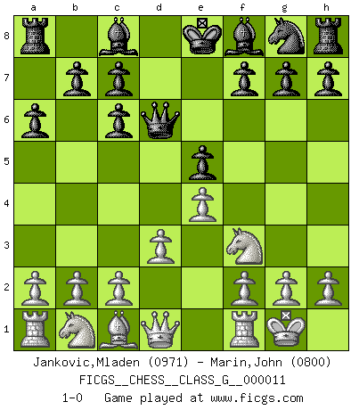 Last move : 1-0 2007 May 4 19:41:17 [Event "FICGS__CHESS__CLASS_G__000011"] [Site "FICGS"] [Date "2007.02.16"] [Round "1"] [White "Jankovic,Mladen"] [Black "Marin,John"] [Result "1-0"] [WhiteElo "0971"] [BlackElo "0800"] 1.e4 e5 2.Nf3 Nc6 3.Bb5 a6 4.Bxc6 dxc6 5.O-O Qd6 6.d3 1-0 This chess game has been lost on time (started : 2007.02.16 19:11:46) Ruy Lopez : Exchange, Bronstein variation Kingside Castling by player White (move 5) Player White won this chess game. Follow this game move after move (download)The Chess pieces are the block alphabet which shapes thoughts; and these thoughts, although making a visual design on the chessboard, express their beauty abstractly, like a poem. (Marcel Duchamp) Aljechin war kein Nazi. Er war ein Opportunist. Ein schrecklicher Mann. Er liebte Geld über alles und würde für Geld ein Jude, ein Katolik oder ein Protestant werden. (Miguel Najdorf) No nos podemos resistir a la fascinación de un sacrificio ya que la pasión por los sacrificios es parte de la naturaleza de un jugador de Ajedrez. (Rudolf Spielman) La tactique, c'est ce que vous faites quand il y a quelque chose à faire; la stratégie, c'est ce que vous faites quand il n'y a rien à faire. (Savielli Tartacower) The Movers & Shakers of this world are those who play chess in the mornings and go to the disco in the evenings. (Dinesh De Silva)