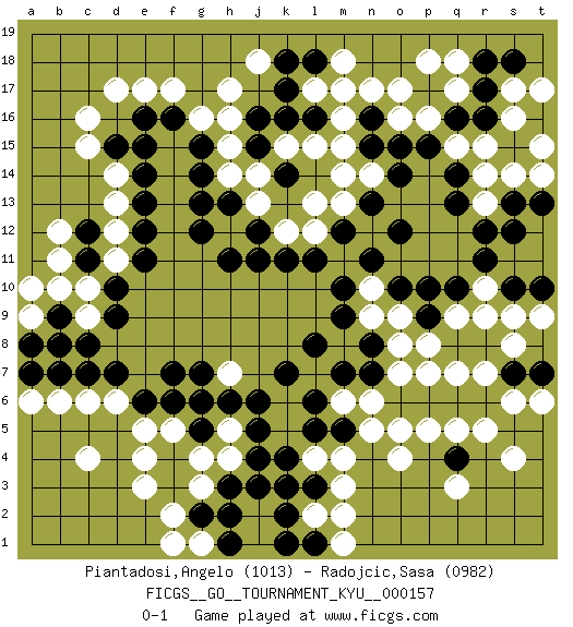 Last move : 0-1 2014 November 20 21:49:11 [Event "FICGS__GO__TOURNAMENT_KYU__000157"] [Site "FICGS"] [Date "2014.06.11"] [Round "1"] [Black "Piantadosi,Angelo"] [White "Radojcic,Sasa"] [Result "0-1"] [Rating 1 "1013"] [Rating 2 "0982"] 1.q16 c4 2.q4 d17 3.k17 h16 4.j15 m16 5.k16 o17 6.p17 o16 7.o14 m14 8.m12 l13 9.j12 l12 10.l11 j13 11.h13 k12 12.k11 h12 13.j11 h14 14.g13 j14 15.g14 h15 16.g12 m13 17.n13 n14 18.o12 h17 19.h11 l17 20.e15 f17 21.e16 e17 22.d10 d12 23.e12 d13 24.e13 d14 25.d15 d11 26.e11 c10 27.d9 c9 28.c8 c15 29.e14 c16 30.k4 h4 31.h6 f5 32.f7 c6 33.g5 g4 34.f6 e5 35.e6 d6 36.d7 m4 37.l6 o4 38.o6 m6 39.m7 n6 40.n7 o5 41.m5 n5 42.l5 q5 43.p6 p5 44.q6 r5 45.r6 s6 46.s7 t6 47.t7 s4 48.o15 p16 49.p15 q17 50.r17 q18 51.n15 m15 52.n16 n17 53.l18 m18 54.h3 g3 55.j3 p8 56.p9 o8 57.n8 o9 58.o10 q9 59.p10 r7 60.r8 q7 61.q8 n9 62.m9 n10 63.n11 q15 64.r16 r15 65.s15 s14 66.r18 p18 67.q14 r14 68.q13 r13 69.r12 s16 70.s13 t15 71.t13 t14 72.s12 s17 73.s18 t17 74.b9 b10 75.b8 l4 76.l3 m3 77.g2 h5 78.j5 g6 79.g7 h7 80.g5 l7 81.k7 p7 82.l8 o7 83.m10 r9 84.q10 r10 85.r11 s8 86.g15 g16 87.f16 g6 88.j6 l2 89.k3 f2 90.h2 e3 91.k2 m2 92.g5 a9 93.a8 a10 94.c11 b11 95.c12 b12 96.c7 b6 97.j4 e4 98.g6 g1 99.h1 f1 100.s10 s9 101.t10 t9 102.l16 m17 103.l1 m1 104.k1 q3 105.b7 a6 106.a7 j18 107.k18 k15 108.j16 pass 109.k14 l15 0-1 Here are the names of the openings (joseki) played in the four corners : Corner q16 : q16 m16 Hoshi (Hwajeom, Seongjeom, Xingwei`) 4-4 Point. The star or hoshi (4-4) point, emphasizing influence at the potential expense of territory. Corner d4 : c4 d9 Komoku (Somok, Xiao~mu`) 3-4 Point. The komoku (3-4) point is the traditional corner enclosure move.. Corner q4 : q4 m4 Hoshi (Hwajeom, Seongjeom, Xingwei`) 4-4 Point. The star or hoshi (4-4) point, emphasizing influence at the potential expense of territory. Player White won this Go (weiqi, baduk) game. Follow this game move after move (download)Dead group ? Always win ko fights ! (Anonymous) I just play for fun. (Anna Kournikova)