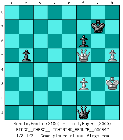 Last move : 1/2-1/2 2014 June 12 13:52:2 [Event "FICGS__CHESS__LIGHTNING_BRONZE__000542"] [Site "FICGS"] [Date "2014.06.12"] [Round "1"] [White "Schmid,Pablo"] [Black "Llull,Roger"] [Result "1/2-1/2"] [WhiteElo "2100"] [BlackElo "2000"] 1.d4 d5 2.c4 e6 3.Nc3 Nf6 4.Bg5 Be7 5.cxd5 Nxd5 6.Bxe7 Qxe7 7.Rc1 Nxc3 8.Rxc3 O-O 9.Nf3 Nc6 10.e3 e5 11.dxe5 Rd8 12.Qc2 Nxe5 13.Rxc7 Nxf3+ 14.gxf3 Qd6 15.Rc3 Bf5 16.e4 Qe7 17.Rc7 Qb4+ 18.Qc3 Qd6 19.Be2 Bd7 20.Rc4 Bh3 21.Rg1 g6 22.Rg3 Be6 23.Rc7 Rac8 24.Rxc8 Rxc8 25.Qd2 Qe5 26.a3 h5 27.h4 Rc6 28.Bd3 Qc7 29.Kf1 Rd6 30.f4 Bc4 31.Qc3 Rxd3 32.Rxd3 Qc6 33.Kg1 Bxd3 34.Qxd3 Qf6 35.f5 gxf5 36.Qg3+ Kh7 37.exf5 Qxf5 38.Kg2 a5 39.Qf3 Qg6+ 40.Kh3 b6 41.b4 axb4 42.axb4 b5 43.Qg3 Qe4 44.f3 Qxb4 45.Qg5 f6 46.Qxh5+ Kg7 47.Qf5 Qc4 48.h5 Qf1+ 49.Kh2 Qf2+ 50.Kh3 Qf1+ 1/2-1/2 QGD : 4.Bg5 Be7 Kingside Castling by player Black (move 8) 10 pieces endgame at move 42 : White KQPPP , Black KQPPP WHITE : King + 1 Queen 3 Pawns BLACK : King + 1 Queen 3 Pawns 9 pieces endgame at move 44 : White KQPP , Black KQPPP WHITE : King + 1 Queen 2 Pawns BLACK : King + 1 Queen 3 Pawns 8 pieces endgame at move 46 : White KQPP , Black KQPP WHITE : King + 1 Queen 2 Pawns BLACK : King + 1 Queen 2 Pawns This chess game ended in a draw. Follow this game move after move (download)Chess is a terrible game. If you have no center, your opponent has a freer position. If you do have a center, then you really have something to worry about ! (Siegbert Tarrasch) Der vorletzte Fehler gewinnt. (Savielly Grigorievitsch Tartakower) Yo creo que el Ajedrez posee una magia que es también una ayuda en la edad avanzada. Una rodilla reumática es olvidada durante una partida de Ajedrez y otros eventos pueden parecer algo sin importancia comparada a una catástrofe en el tablero de Ajedrez. (Vlastimil Hort) A ce moment-là, je menaçais de comprendre la position ! (Clément L'Heureux) Now you put water in a cup, it becomes the cup; You put water into a bottle it becomes the bottle; You put it in a teapot it becomes the teapot. Water can flow or it can crash. Be water, my friend. (Bruce Lee)