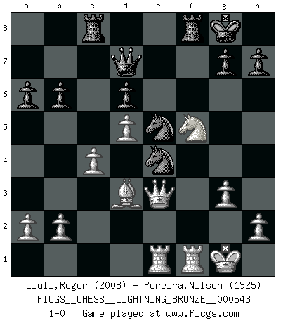 Last move : 1-0 2014 June 12 17:30:47 [Event "FICGS__CHESS__LIGHTNING_BRONZE__000543"] [Site "FICGS"] [Date "2014.06.12"] [Round "1"] [White "Llull,Roger"] [Black "Pereira,Nilson"] [Result "1-0"] [WhiteElo "2008"] [BlackElo "1925"] 1.e4 c5 2.Nf3 d6 3.d4 cxd4 4.Nxd4 Nf6 5.Nc3 a6 6.Be2 e5 7.Nb3 Be7 8.O-O Be6 9.Qd3 O-O 10.Be3 Nbd7 11.Nd5 Bxd5 12.exd5 Rc8 13.c4 Ne8 14.Qd2 f5 15.g3 Nef6 16.f3 b6 17.Rad1 Qe8 18.Bd3 e4 19.fxe4 Nxe4 20.Qe2 Bg5 21.Rde1 Ne5 22.Nd4 Bxe3+ 23.Qxe3 Qd7 24.Nxf5 1-0 This chess game has been lost on time (started : 2014.06.12 14:17:50) Sicilian : Najdorf, Opovcensky variation Kingside Castling by player White (move 8) Kingside Castling by player Black (move 9) Player White won this chess game. Follow this game move after move (download)When the Chess game is over, the Pawn and the King go back to the same box. (Irish saying) Je mehr wir mit Computern analysieren, desto mehr glauben wir an Verteidigung. (Vladimir Kramnik) Bobby Fischer es el mas grande genio de Ajedrez de todos los tiempos. (Alexander Kotov) Plusieurs personnes se sont demandées comment Tal faisait pour gagner... En fait, c'est très simple ! Il met ses pièces au centre de l'échiquier et les sacrifie quelque part ! (David Bronstein) The existence of forgetting has never been proved: We only know that some things don't come to mind when we want them. (Friedrich Nietzsche)