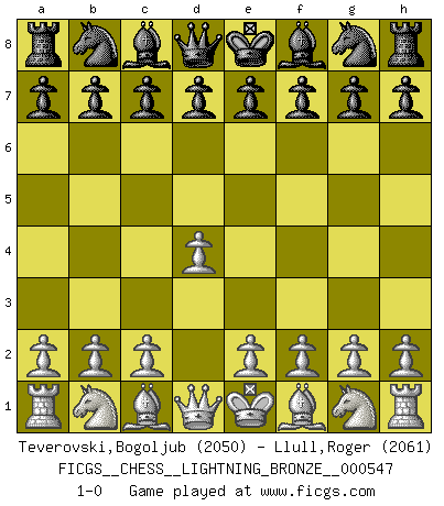 Last move : 1-0 2014 June 13 11:5:39 [Event "FICGS__CHESS__LIGHTNING_BRONZE__000547"] [Site "FICGS"] [Date "2014.06.13"] [Round "1"] [White "Teverovski,Bogoljub"] [Black "Llull,Roger"] [Result "1-0"] [WhiteElo "2050"] [BlackElo "2061"] 1.d4 1-0 This chess game has been lost on time (started : 2014.06.13 10:41:11) Queen's pawn Player White won this chess game. Follow this game move after move (download)A bad day of Chess is better than any good day at work. (Anonymous) Wenn ein Kopf und ein Buch zusammenstoßen und es klingt hohl, ist es denn allemal im Buche? (Georg Christoph Lichtenberg) Un mal día en el Ajedrez, es mejor que cualquier buen día en el trabajo. (Anonymous) L'attaque fait le spectacle, la défense gagne les matchs. (Dicton footballistique) The faster the computer, the slower the brain. (Thibault de Vassal)