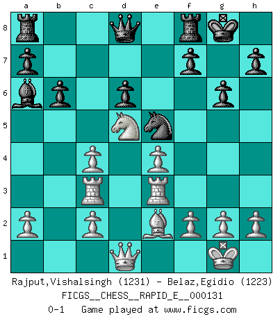 Last move : 0-1 2014 August 18 17:34:33 [Event "FICGS__CHESS__RAPID_E__000131"] [Site "FICGS"] [Date "2014.06.13"] [Round "1"] [White "Rajput,Vishalsingh"] [Black "Belaz,Egidio"] [Result "0-1"] [WhiteElo "1231"] [BlackElo "1223"] 1.e4 c5 2.Bc4 Nc6 3.Nf3 e6 4.O-O Nf6 5.Re1 Be7 6.Nc3 Na5 7.Be2 e5 8.b3 b6 9.Nxe5 O-O 10.Bf3 d6 11.Nd3 c4 12.bxc4 Nd7 13.Nb2 Ba6 14.d3 Bf6 15.Bd2 Nc6 16.Nd5 Bxb2 17.Rb1 Ba3 18.Rb3 Bc5 19.Be3 Bxe3 20.Rxe3 Na5 21.Rc3 Ne5 22.Be2 Nac6 23.d4 g6 24.dxe5 Nxe5 0-1 This chess game has been lost on time (started : 2014.06.13 18:17:41) Sicilian defense Kingside Castling by player White (move 4) Kingside Castling by player Black (move 9) Player Black won this chess game. Follow this game move after move (download)Avoid the crowd. Do your own thinking independently. Be the Chess player, not the Chess piece. (Ralph Charell) Wenn ich einen Club besuche, sind die Spieler stumm vor Staunen. (José Raúl Capablanca) Un mal plan es mejor que no tener ningún plan. (Frank Marshall) D'abord les bases : Jouez et étudiez, puis étudiez et jouez, ensuite jouez et étudiez, puis étudiez et jouez. Deuxièmement : Donnez toujours le meilleur de vous-même ! (Ken Smith) They misunderestimated me. (George W. Bush, Bentonville nov. 6, 2000)