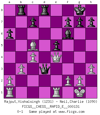 Last move : 0-1 2014 August 20 17:37:12 [Event "FICGS__CHESS__RAPID_E__000131"] [Site "FICGS"] [Date "2014.06.13"] [Round "1"] [White "Rajput,Vishalsingh"] [Black "Neil,Charlie"] [Result "0-1"] [WhiteElo "1231"] [BlackElo "1090"] 1.e4 e5 2.Bc4 Nc6 3.Nf3 Nf6 4.Nc3 Nxe4 5.Nxe4 d5 6.Bd3 dxe4 7.Bxe4 Bg4 8.h3 Bxf3 9.Qxf3 Qd6 10.Bxc6+ bxc6 11.d3 Be7 12.O-O Rb8 13.b3 O-O 14.Be3 c5 15.Rfe1 Bf6 16.Qe4 Rb4 17.c4 Rd8 18.Bd2 R4b8 19.Be3 Qxd3 20.Bxc5 a6 0-1 This chess game has been lost on time (started : 2014.06.13 18:17:41) Bishop's Opening Kingside Castling by player White (move 12) Kingside Castling by player Black (move 13) Player Black won this chess game. Follow this game move after move (download)Place the contents of the Chess box in a hat, shake them up vigorously, pour them on the board from a height of two feet, and you get the style of Steinitz. (H. E. Bird) Der beste Spieler in einem Turnier gewinnt es nie. Er landet auf Platz zwei oder drei. (Siegbert Tarrasch) El Ajedrez tiene tanto misterio como las mujeres. (Purdy) J'ai toujours senti une vague pitié pour l'homme qui ne connaît rien aux échecs, tout comme j'en aurais pour un homme ignorant de l'amour. Les Echecs, comme la musique ou comme l'amour, ont le pouvoir de rendre heureux. (Siegbert Tarrasch) Life is like a ten-speed bicycle: most of us have gears we never use. (Charles M. Schulz)