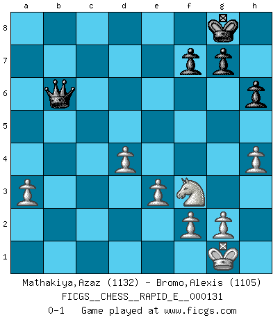 Last move : 0-1 2014 August 23 5:39:17 [Event "FICGS__CHESS__RAPID_E__000131"] [Site "FICGS"] [Date "2014.06.13"] [Round "1"] [White "Mathakiya,Azaz"] [Black "Bromo,Alexis"] [Result "0-1"] [WhiteElo "1132"] [BlackElo "1105"] 1.d4 d5 2.c4 e6 3.Nf3 Nc6 4.e3 Bb4+ 5.Bd2 a5 6.Qa4 Bxd2+ 7.Nbxd2 Bd7 8.cxd5 exd5 9.Nb1 Nb4 10.Qb3 Nf6 11.a3 a4 12.Qxb4 b6 13.Bb5 Bxb5 14.Qxb5+ Nd7 15.Qxd5 O-O 16.O-O h6 17.Nc3 Re8 18.h4 Nf6 19.Qc4 b5 20.Qxb5 Rb8 21.Qxa4 Rxb2 22.Rab1 Rxb1 23.Rxb1 Ne4 24.Nxe4 Rxe4 25.Qc6 Re6 26.Qb7 Rb6 27.Rxb6 cxb6 28.Qxb6 Qxb6 0-1 Queen's gambit declined Kingside Castling by player Black (move 15) Kingside Castling by player White (move 16) Player Black won this chess game. Follow this game move after move (download)It is no time to be playing Chess when the house is on fire. (Italian Proverb) Taktik ist was man tun muß, wenn etwas zu tun ist. Strategie ist was man tun muß, wenn nichts zu tun ist. (Savielly Grigorievitsch Tartakower) Cuando me preguntan: -¿Cual es el secreto que te hace hacer mejores movidas que tus oponentes?, Yo respondo: Me da gusto que me pregunten eso, porque, como veran, hay una simple razón. Yo pienso mis propias movidas y dejo a mi oponente que el piense las suyas. (Alexander Alekhine) Les sacrifices démontrent seulement que quelqu'un a gaffé. (Savielly Tartacover) There's no money in correspondence chess. (John Knudsen)