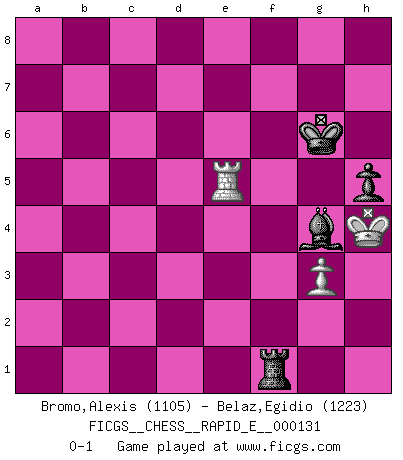 Last move : 0-1 2014 August 22 19:15:42 [Event "FICGS__CHESS__RAPID_E__000131"] [Site "FICGS"] [Date "2014.06.13"] [Round "1"] [White "Bromo,Alexis"] [Black "Belaz,Egidio"] [Result "0-1"] [WhiteElo "1105"] [BlackElo "1223"] 1.d4 d5 2.c4 Nf6 3.Nc3 dxc4 4.e3 e6 5.Bxc4 Bb4 6.Bd2 O-O 7.Nf3 Nc6 8.a3 Be7 9.h3 Na5 10.O-O Nxc4 11.Rb1 Nxd2 12.Qxd2 b6 13.Rfc1 Bb7 14.Qe2 c5 15.dxc5 Bxc5 16.b4 Be7 17.Rd1 Qe8 18.Ne5 Rc8 19.Rbc1 Nd5 20.Nxd5 Rxc1 21.Nxe7+ Qxe7 22.Rxc1 Qg5 23.f3 Qxe5 24.e4 Qf4 25.Rd1 a5 26.bxa5 bxa5 27.Qb5 Qc7 28.Rd7 Qc1+ 29.Kh2 Bc8 30.Ra7 Qxa3 31.Rxa5 Qd6+ 32.Qe5 Qxe5+ 33.Rxe5 f6 34.Ra5 e5 35.Kg3 Kf7 36.f4 exf4+ 37.Kxf4 g5+ 38.Kg3 Kg6 39.e5 fxe5 40.Rxe5 h5 41.h4 gxh4+ 42.Kxh4 Bg4 43.g3 Rf1 0-1 QGD : Marshall defense Kingside Castling by player Black (move 6) Kingside Castling by player White (move 10) 10 pieces endgame at move 39 : White KRPP , Black KRBPPP WHITE : King + 1 Rook 2 Pawns BLACK : King + 1 Rook 1 Bishop 3 Pawns 9 pieces endgame at move 40 : White KRPP , Black KRBPP WHITE : King + 1 Rook 2 Pawns BLACK : King + 1 Rook 1 Bishop 2 Pawns 8 pieces endgame at move 41 : White KRP , Black KRBPP WHITE : King + 1 Rook 1 Pawn BLACK : King + 1 Rook 1 Bishop 2 Pawns 7 pieces endgame at move 42 : White KRP , Black KRBP WHITE : King + 1 Rook 1 Pawn BLACK : King + 1 Rook 1 Bishop 1 Pawn Player Black won this chess game. Follow this game move after move (download)A player surprised is half beaten. (Proverb) Obwohl ich vom Stil her kaum zu den Priestern der Schachkunst gezählt werde, halte ich Schach doch für eine Kunst. (Tigran Petrosjan) Durante una competencia de Ajedrez, un Maestro de Ajedrez deberá ser una combinación de presa de caza y un Monge. (Alexander Alekhine) J'ai vu le vaincu d'Echecs jouer des années durant dans l'espoir de la fête de la victoire. Car tu es plus riche de ce qu'elle existe si même elle n'est point pour toi. Ainsi de la perle du fond des mers. (Antoine de Saint-Exupéry) If I had no sense of humor, I would long ago have committed suicide. (Mahatma Gandhi)