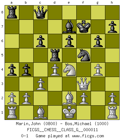 Last move : 0-1 2007 May 23 16:43:52 [Event "FICGS__CHESS__CLASS_G__000011"] [Site "FICGS"] [Date "2007.02.16"] [Round "1"] [White "Marin,John"] [Black "Bos,Michael"] [Result "0-1"] [WhiteElo "0800"] [BlackElo "1000"] 1.e4 d5 2.exd5 Nf6 3.Bb5+ Bd7 4.Bc4 b5 5.Bb3 e6 6.Qe2 Be7 7.dxe6 fxe6 8.Nf3 Qc8 9.Ne5 Nc6 10.Nxd7 Nd4 11.Nxf6+ Bxf6 12.Qh5+ g6 13.Qg4 a5 14.c3 a4 15.Bd1 Nf5 16.Be2 c6 17.d4 Kf7 18.Qf3 Rd8 19.Nd2 b4 20.Ne4 Be7 21.g4 Rd5 0-1 Scandinavian defense Player Black won this chess game. Follow this game move after move (download)Chess is no whit inferior to the violin, and we have a large number of professional violinists. (Mikhail Botvinnik) Es ist im Leben wie im Schachspiel. Wir entwerfen einen Plan, dieser bleibt jedoch bedingt durch das, was im Schachspiel dem Gegner, im Leben dem Schicksal zu tun belieben wird. (Arthur Schopenhauer) El Ajedrez es una hermosa aventura. (Bent Larsen) Même un GMI sait rarement calculer sur plus de cinq coups une attaque à sacrifices. (Rudolf Spielmann) Patience, use the Force, think ! (Obi-Wan Kenobi in Star Wars ep.2)
