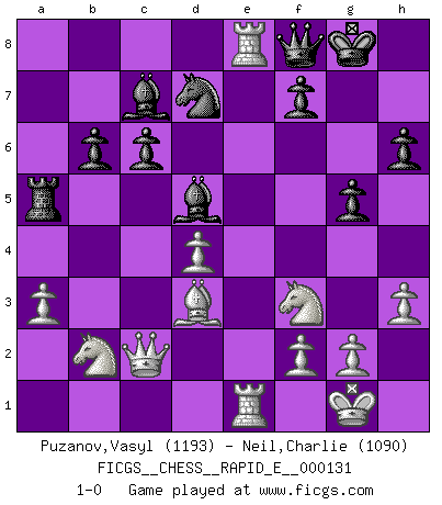 Last move : 1-0 2014 September 11 23:55:15 [Event "FICGS__CHESS__RAPID_E__000131"] [Site "FICGS"] [Date "2014.06.13"] [Round "1"] [White "Puzanov,Vasyl"] [Black "Neil,Charlie"] [Result "1-0"] [WhiteElo "1193"] [BlackElo "1090"] 1.e4 e6 2.d4 d5 3.exd5 exd5 4.Nf3 Bg4 5.Be2 Qe7 6.O-O Nf6 7.Bg5 Nbd7 8.Re1 Qd6 9.h3 Be6 10.a3 Be7 11.Nc3 h6 12.Bxf6 Bxf6 13.Bd3 O-O 14.Qd2 Rfe8 15.Re2 c6 16.Rae1 Bd8 17.b4 Bc7 18.Na4 b6 19.Nb2 g5 20.c4 Qf8 21.Qc2 a5 22.bxa5 Rxa5 23.cxd5 Bxd5 24.Rxe8 1-0 French : Exchange variation Kingside Castling by player White (move 6) Kingside Castling by player Black (move 13) Player White won this chess game. Follow this game move after move (download)Good offense and good defense both begin with good development. (Bruce A. Moon) Im Fernschach kannst du während dem Spiel rauchen. (John Christen Knudsen) El arma más poderosa en el Ajedrez, es tener la próxima movida. (David Bronstein) Avant la finale, les dieux ont créé le milieu de partie. (Tarrasch) Heh, heh, heh. Time to abandon ship. (General Grievous in Star Wars ep.3)
