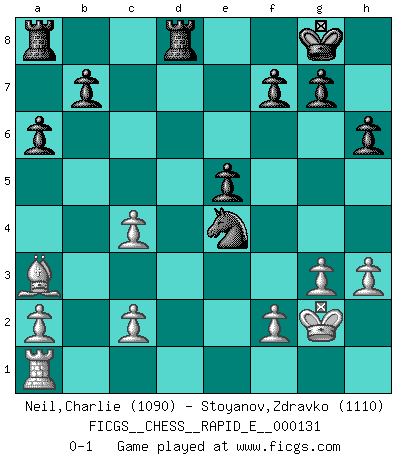 Last move : 0-1 2014 July 14 0:17:13 [Event "FICGS__CHESS__RAPID_E__000131"] [Site "FICGS"] [Date "2014.06.13"] [Round "1"] [White "Neil,Charlie"] [Black "Stoyanov,Zdravko"] [Result "0-1"] [WhiteElo "1090"] [BlackElo "1110"] 1.e4 c5 2.Nf3 a6 3.d4 cxd4 4.Nxd4 e5 5.Nf3 Nc6 6.g3 h6 7.Bg2 Nf6 8.Nc3 Bb4 9.Qd3 O-O 10.O-O Bxc3 11.bxc3 d6 12.Ba3 Re8 13.Qxd6 Nxe4 14.Qxd8 Rxd8 15.c4 Bg4 16.h3 Bxf3 17.Bxf3 Nd2 18.Be2 Nxf1 19.Kxf1 Nd4 20.Bd3 Nf3 21.Be4 Nd2+ 22.Kg2 Nxe4 0-1 Sicilian : O'Kelly variation Kingside Castling by player Black (move 9) Kingside Castling by player White (move 10) Player Black won this chess game. Follow this game move after move (download)Personally, I rather look forward to a computer program winning the world Chess Championship. Humanity needs a lesson in humility. (Richard Dawkings) Der Partner hat auch seine Existenzberechtigung. (Savielly Grigorievitsch Tartakower) El Ajedrez es un mar en el cual un mosquito puede beber y un elefante puede bañarse. (Refrán Hindú) Celui qui prend des risques peut perdre, celui qui n'en prend pas perd toujours. (Xavier Tartacover) Somewhere in the world there is an epigram for every dilemma. (Hendrik Willem van Loon)