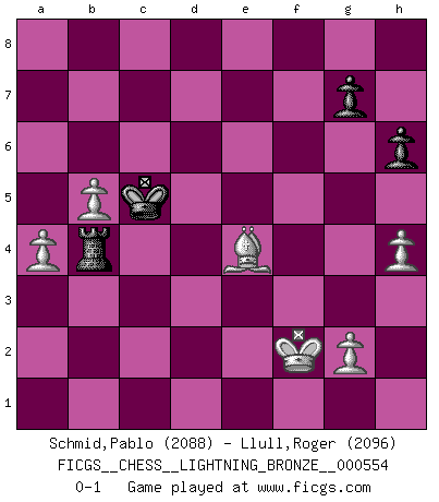 Last move : 0-1 2014 June 15 23:0:35 [Event "FICGS__CHESS__LIGHTNING_BRONZE__000554"] [Site "FICGS"] [Date "2014.06.15"] [Round "1"] [White "Schmid,Pablo"] [Black "Llull,Roger"] [Result "0-1"] [WhiteElo "2088"] [BlackElo "2096"] 1.d4 d5 2.c4 c6 3.Nf3 Nf6 4.Nc3 a6 5.c5 Bg4 6.Ne5 Bh5 7.Qb3 Ra7 8.e4 e6 9.exd5 exd5 10.Bd3 Nbd7 11.O-O Nxe5 12.Re1 Nfd7 13.Bf4 Be7 14.Bxe5 O-O 15.Bc7 Qxc7 16.Rxe7 Bg4 17.Rae1 Qf4 18.h3 Be6 19.R1xe6 fxe6 20.Rxd7 Qxf2+ 21.Kh1 Qxd4 22.Qd1 Qe3 23.Qg4 Qe1+ 24.Kh2 Qe5+ 25.Qg3 Qxg3+ 26.Kxg3 e5 27.Bc2 e4 28.Bb3 e3 29.Re7 Rf2 30.Nxd5 cxd5 31.c6 bxc6 32.Rxa7 Kf8 33.Rxa6 Rf1 34.Rxc6 e2 35.Re6 e1Q+ 36.Rxe1 Rxe1 37.Bxd5 Re2 38.b4 Ke7 39.a4 Kd6 40.Bb7 Rb2 41.Be4 Rb3+ 42.Kf2 h6 43.b5 Kc5 44.h4 Rb4 0-1 QGD Slav : 4.Nc3 Kingside Castling by player White (move 11) Kingside Castling by player Black (move 14) Promotion Queen by player Black (move 35) 10 pieces endgame at move 37 : White KBPPPP , Black KRPP WHITE : King + 1 Bishop 4 Pawns BLACK : King + 1 Rook 2 Pawns Player Black won this chess game. Follow this game move after move (download)A good player is always lucky. (Jose Raul Capablanca) Drei Punkte vor allen anderen ist wie einer, der im weißen Anzug posiert, während der Rest in Müllsäcke gekleidet dasteht. (Viktor Kortschnoi) En un gambito tu regalas un Peón por el bién de tomar un juego perdido. (Samuel Standige Boden) Pour moi, les échecs ne sont pas un jeu mais un art. (Alexandre Alekhine) Every vice is only an exaggeration of a necessary and virtuous function. (Ralph Waldo Emerson, Journals 1936)