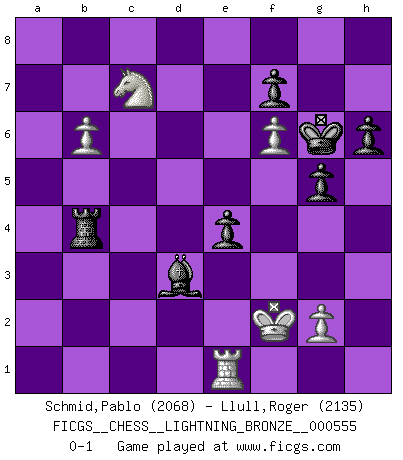 Last move : 0-1 2014 June 16 0:18:26 [Event "FICGS__CHESS__LIGHTNING_BRONZE__000555"] [Site "FICGS"] [Date "2014.06.15"] [Round "1"] [White "Schmid,Pablo"] [Black "Llull,Roger"] [Result "0-1"] [WhiteElo "2068"] [BlackElo "2135"] 1.d4 d5 2.c4 e6 3.Nc3 Nf6 4.Nf3 h6 5.Bf4 Bd6 6.Bg3 O-O 7.e3 b6 8.cxd5 exd5 9.Ne5 Bb7 10.Be2 Nbd7 11.Rc1 a6 12.O-O Re8 13.f4 c5 14.Bh4 Be7 15.Bh5 Nxh5 16.Qxh5 Rf8 17.Bxe7 Qxe7 18.Rf3 Nf6 19.Qh4 Rae8 20.Rg3 Ne4 21.Qxe7 Rxe7 22.Nxe4 dxe4 23.f5 Rc7 24.f6 g6 25.dxc5 Rd8 26.c6 Bc8 27.Ng4 Kh7 28.h4 Rd6 29.h5 g5 30.Rc4 Bf5 31.Rd4 Rdxc6 32.Nf2 Rc1+ 33.Kh2 R1c4 34.b3 Rxd4 35.exd4 Rc2 36.Nd1 Rxa2 37.Ne3 Ra5 38.d5 Bc8 39.Kg1 Rb5 40.Nc4 Rxd5 41.Nxb6 Rd1+ 42.Kf2 Be6 43.Re3 Rd2+ 44.Kf1 Rd4 45.Na4 Bg4 46.Nc5 Bxh5 47.Nxa6 Kg6 48.b4 Bg4 49.b5 Be6 50.Nc7 Bc4+ 51.Kf2 Bd3 52.Re1 Rc4 53.b6 Rb4 0-1 QGD : 4.Nf3 Kingside Castling by player Black (move 6) Kingside Castling by player White (move 12) Player Black won this chess game. Follow this game move after move (download)Life is a kind of Chess, with struggle, competition, good and ill events. (Benjamin Franklin) Ein unbeabsichtigtes Patt ist der Gipfel der Dummheit. (Anonymous) Nunca nadie ha ganado una partida de Ajedrez rindiendose. (Unknown) Les Echecs, c'est l'art de la guerre sans les charniers, c'est la résurrection des morts tombés au champ d'honneur, l'espoir perpétuel, la suprématie de l'intelligence sur la force, la culture de l'esprit. (F. Szpiner) When the going gets tactical, the computers get going. (Hyatt)
