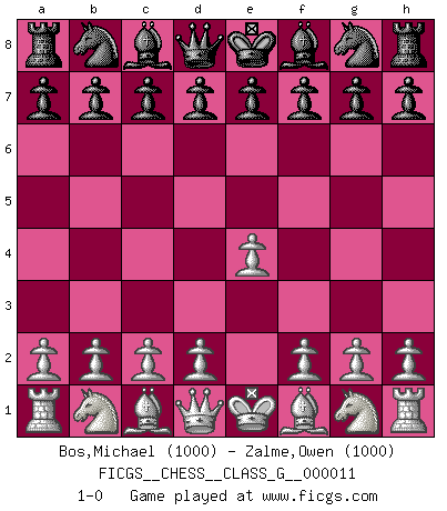 Last move : 1-0 2007 March 29 15:14:42 [Event "FICGS__CHESS__CLASS_G__000011"] [Site "FICGS"] [Date "2007.02.16"] [Round "1"] [White "Bos,Michael"] [Black "Zalme,Owen"] [Result "1-0"] [WhiteElo "1000"] [BlackElo "1000"] 1.e4 1-0 This chess game has been lost on time (started : 2007.02.16 19:11:46) King's pawn Opening Player White won this chess game. Follow this game move after move (download)Winning isn't everything... but losing is nothing. (Mednis) Herr Iljumschinow ist ein etwas merkwürdiger Geschäftsmann: Er arbeitet zusammen mit Leuten wie Muammar al-Gaddafi; früher ist das Saddam Hussein gewesen. (Joel Lautier) Todo se encuentra en un estado de flujo y esto incluye al mundo del Ajedrez. (Mikhail Botvinnik) Psychologiquement, tu dois avoir confiance en toi même, mais cette confiance doit être basée sur des faits. (Robert Fischer) A bird doesn't sing because it has an answer, it sings because it has a song. (Maya Angelou)