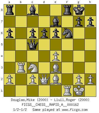 Last move : 1/2-1/2 2014 June 27 22:30:44 [Event "FICGS__CHESS__RAPID_A__000162"] [Site "FICGS"] [Date "2014.06.18"] [Round "1"] [White "Douglas,Mike"] [Black "Llull,Roger"] [Result "1/2-1/2"] [WhiteElo "2000"] [BlackElo "2000"] 1.e4 c5 2.Nf3 d6 3.d4 cxd4 4.Nxd4 Nf6 5.Nc3 a6 6.Bg5 e6 7.f4 Qb6 8.Qd2 Qxb2 9.Rb1 Qa3 10.f5 Nc6 11.fxe6 fxe6 12.Nxc6 bxc6 13.Be2 Be7 14.O-O O-O 15.Rb3 Qc5+ 16.Be3 Qe5 17.Bf4 Qc5+ 18.Be3 Qe5 19.Bf4 Qc5+ 20.Be3 1/2-1/2 Sicilian : Najdorf, 7...Qb6 Kingside Castling by player White (move 14) Kingside Castling by player Black (move 14) This chess game ended in a draw. Follow this game move after move (download)No Chess Grandmaster is normal; they only differ in the extent of their madness. (Viktor Korchnoi) Nie in meinem Leben habe ich die französische Verteidigung gespielt, welche die Stumpfsinnigste von allen ist. (Wilhelm Steinitz) Evita las multitudes. Haz independientemente tu propio razonamiento. Trata de ser el jugador de Ajedrez, no la pieza de Ajedrez. (Ralph Charell) Le jeu d'échecs fait naître et fortifie en nous plusieurs qualités précieuses dans le cours de l'existence, telles que la prévoyance, la circonspection, la prudence, et la persévérance. (Benjamin Franklin - 1783, la morale des échecs) Faith : not wanting to know what is true. (Friedrich Nietzsche)