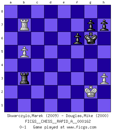 Last move : 0-1 2014 August 18 11:51:20 [Event "FICGS__CHESS__RAPID_A__000162"] [Site "FICGS"] [Date "2014.06.18"] [Round "1"] [White "Skwarczylo,Marek"] [Black "Douglas,Mike"] [Result "0-1"] [WhiteElo "2009"] [BlackElo "2000"] 1.d4 f5 2.e4 fxe4 3.f3 d5 4.fxe4 dxe4 5.Bc4 Nf6 6.Nc3 Nc6 7.Nge2 Bg4 8.d5 Na5 9.Qd4 c6 10.Nxe4 Qd7 11.h3 Nxc4 12.Qxc4 Bxe2 13.Nxf6+ exf6 14.Qxe2+ Kf7 15.dxc6 Bb4+ 16.c3 Qxc6 17.O-O Rae8 18.Qd3 Bc5+ 19.Kh1 Re4 20.Bf4 Rhe8 21.b4 Bb6 22.Rad1 Re2 23.Rf3 Qe4 24.Qxe4 R8xe4 25.a4 Re1+ 26.Rxe1 Rxe1+ 27.Kh2 a5 28.Rd3 Ke8 29.Rd5 axb4 30.cxb4 Rb1 31.Bd2 Rd1 32.Rd3 Bf2 33.a5 Kf7 34.b5 Be1 35.Rd7+ Kg6 36.Rxb7 Bxd2 37.a6 Bf4+ 38.g3 Rd2+ 39.Kh1 Bxg3 40.a7 Rh2+ 41.Kg1 Ra2 42.Kf1 Bf2 43.a8Q Rxa8 44.Kxf2 Ra3 45.Kg2 Rb3 0-1 Dutch : Staunton gambit Kingside Castling by player White (move 17) Promotion Queen by player White (move 43) 10 pieces endgame at move 43 : White KRPP , Black KRBPPP WHITE : King + 1 Rook 2 Pawns BLACK : King + 1 Rook 1 Bishop 3 Pawns 9 pieces endgame at move 44 : White KRPP , Black KRPPP WHITE : King + 1 Rook 2 Pawns BLACK : King + 1 Rook 3 Pawns Player Black won this chess game. Follow this game move after move (download)Fischer, who may or may not be mad as a hatter, has every right to be horrified. (Jeremy Silman) Wer sich die Fähigkeit anerziehen will im Schach selbstständig zu denken, der muß alles meiden, was leblos ist: ausgeklügelte Theorien, die sich auf sehr wenige Beispiele und eine Menge Hirngespinste stützen. (Emanuel Lasker) No es tiempo de jugar al Ajedrez cuando la casa esta en llamas. (Proverbio Italiano) J'ai vu le vaincu d'Echecs jouer des années durant dans l'espoir de la fête de la victoire. Car tu es plus riche de ce qu'elle existe si même elle n'est point pour toi. Ainsi de la perle du fond des mers. (Antoine de Saint-Exupéry) When it is a question of money, everybody is of the same religion. (Voltaire)