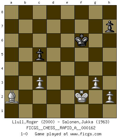 Last move : 1-0 2014 July 28 15:42:3 [Event "FICGS__CHESS__RAPID_A__000162"] [Site "FICGS"] [Date "2014.06.18"] [Round "1"] [White "Llull,Roger"] [Black "Salonen,Jukka"] [Result "1-0"] [WhiteElo "2000"] [BlackElo "1963"] 1.e4 e5 2.Nf3 Nc6 3.Bc4 Bc5 4.c3 Nf6 5.d3 a6 6.O-O d6 7.b4 Ba7 8.Bb3 O-O 9.Nbd2 Ne7 10.a4 Ng6 11.Nc4 Bd7 12.Be3 Bxe3 13.Nxe3 a5 14.Re1 Nf4 15.Qc2 c6 16.bxa5 Rxa5 17.g3 Nh3+ 18.Kg2 Ng4 19.Nc4 Ra7 20.Nxd6 Qf6 21.Nf5 Nhxf2 22.Qe2 Bxf5 23.exf5 Qh6 24.Rf1 Nxd3 25.Qxd3 Ne3+ 26.Kh1 Nxf1 27.Rxf1 b5 28.Nxe5 bxa4 29.Bc4 a3 30.Qd4 Rb7 31.f6 gxf6 32.Ng4 Qg7 33.Nxf6+ Kh8 34.Rf4 c5 35.Qe4 Rb6 36.Nd7 a2 37.Bxa2 f5 38.Rxf5 Rxf5 39.Qe8+ Rf8 40.Nxf8 Qb7+ 41.Kg1 Kg7 42.Ne6+ Rxe6 43.Qxe6 Qf3 44.Qe5+ Qf6 45.Qxf6+ Kxf6 46.Kf2 1-0 Giuoco Piano Kingside Castling by player White (move 6) Kingside Castling by player Black (move 8) 10 pieces endgame at move 43 : White KQBPPP , Black KQPP WHITE : King + 1 Queen 1 Bishop 3 Pawns BLACK : King + 1 Queen 2 Pawns 9 pieces endgame at move 45 : White KQBPPP , Black KPP WHITE : King + 1 Queen 1 Bishop 3 Pawns BLACK : King + 2 Pawns 8 pieces endgame at move 45 : White KBPPP , Black KPP WHITE : King + 1 Bishop 3 Pawns BLACK : King + 2 Pawns Player White won this chess game. Follow this game move after move (download)Help your pieces so they can help you. (Paul Morphy) Wenn du auf das Glück wartest, wird das Leben ziemlich langweilig. (Mikhail Nekhemyevich Tal) Juega la Apertura como un libro, el Juego Medio como un mago y los Finales como una máquina. (Spielmann) Les écrivains ont utilisé les échecs pour analyser les côtés extrêmes de la nature humaine. Dans ce cadre, les échecs offrent un champ d'expérimentation idéal. Mais on pourrait faire la même chose avec la peinture. Et là, en vous référant à Van Gogh, vous ne tirerez pas de conclusion définitive sur les peintres. (Gary Kasparov) I couldn't make any sense out of what this particular thread is about. It sounds like R2 D2 computer speaking. A space fight ?!? Some 'command' problems in Moscow ? Some killers & narcotic addicts attacking some game & a god wannabe ?? (Dinesh De Silva, lost in a russian conflict in FICGS forum)