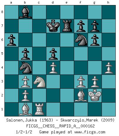 Last move : 1/2-1/2 2014 August 11 10:8:19 [Event "FICGS__CHESS__RAPID_A__000162"] [Site "FICGS"] [Date "2014.06.18"] [Round "1"] [White "Salonen,Jukka"] [Black "Skwarczylo,Marek"] [Result "1/2-1/2"] [WhiteElo "1963"] [BlackElo "2009"] 1.d4 d5 2.c4 c6 3.Nf3 Nf6 4.e3 Bg4 5.h3 Bh5 6.Nc3 e6 7.Bd3 Nbd7 8.cxd5 exd5 9.Qb3 Qb6 10.Nh4 Qxb3 11.axb3 Bg6 12.Nxg6 hxg6 13.f3 a6 14.Bd2 Be7 15.O-O O-O-O 16.Ne2 Kb8 17.Kh2 Nf8 18.g3 Ne6 19.Ba5 Rde8 20.Kg2 Bd6 21.Bd2 c5 22.Rfd1 cxd4 23.exd4 Nh5 24.Be1 Re7 25.Bf2 Rc8 26.Rdc1 Rxc1 27.Rxc1 Nf6 28.Be1 Nd8 29.Nc3 Nc6 30.Bf2 Nb4 31.Bb1 b5 32.Rf1 Kb7 33.h4 Bb8 34.Rd1 Kc8 35.Rh1 Kd7 36.Rc1 1/2-1/2 QGD Slav : 4.e3 Kingside Castling by player White (move 15) Queenside Castling by player Black (move 15) This chess game ended in a draw. Follow this game move after move (download)I prefer to lose a really good game than to win a bad one. (David Levy) Moralische Siege zählen nicht. (Savielly Grigorievitsch Tartakower) El ganador de una partida es aquel jugador que hace el penúltimo error. (Savielly Tartakover) Nous vivons dans un monde échiquéen : chaque jour qui passe est un défi à relever. (Philosophe Sasha) You know what they say : You lie down with the Devil, you wake up in Hell. (Horatio Caine, C.S.I. Miami)