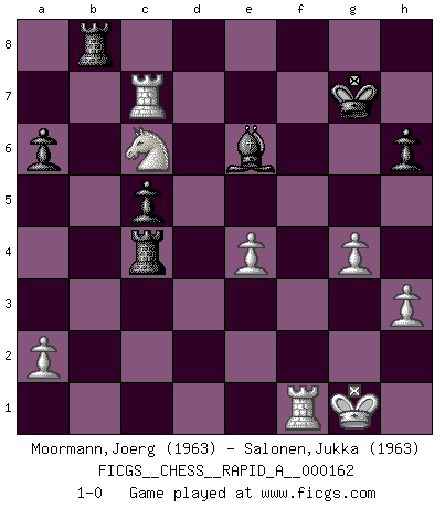 Last move : 1-0 2014 September 24 11:55:50 [Event "FICGS__CHESS__RAPID_A__000162"] [Site "FICGS"] [Date "2014.06.18"] [Round "1"] [White "Moormann,Joerg"] [Black "Salonen,Jukka"] [Result "1-0"] [WhiteElo "1963"] [BlackElo "1963"] 1.e4 e5 2.Nf3 Nc6 3.Bb5 a6 4.Ba4 Nf6 5.O-O Be7 6.Re1 b5 7.Bb3 d6 8.c3 O-O 9.h3 Na5 10.Bc2 c5 11.d4 Qc7 12.d5 Bd7 13.b3 Nb7 14.c4 bxc4 15.bxc4 Na5 16.Bd3 Ra7 17.Na3 Rb8 18.Bd2 g6 19.Nc2 Nb7 20.Ne3 Na5 21.Qc1 Kg7 22.Bc3 h6 23.Nh2 Nh5 24.Be2 Nf6 25.Qc2 Rab7 26.Rf1 Rb4 27.Bd3 Nh5 28.f4 f6 29.fxe5 dxe5 30.Nhg4 Nb7 31.d6 Nxd6 32.Nxe5 fxe5 33.Bxe5+ Kg8 34.Nd5 Qd8 35.g4 Ng7 36.Qh2 R8b6 37.Bxg7 Kxg7 38.Qe5+ Kh7 39.Nxe7 Qe8 40.Qf6 Nxc4 41.Qf7+ Qxf7 42.Rxf7+ Kh8 43.Bxc4 Rxc4 44.Raf1 Be6 45.Nxg6+ Kg8 46.Rc7 Rb8 47.Ne7+ Kg7 48.Nc6 1-0 Ruy Lopez : Closed Kingside Castling by player White (move 5) Kingside Castling by player Black (move 8) Player White won this chess game. Follow this game move after move (download)If your opponent cannot do anything active, then don't rush the position; instead you should let him sit there, suffer, and beg you for a draw. (Jeremy Silman) Ich war zu klein für die Schach-Schülermannschaft! (Woody Allen) Haz el enroque temprano y seguido. (Rob Sillars) La guerre est enfant de la passion, la passion est enfant du narcissisme et le narcissisme est l'enfant. (...) Une autre partie ? (Thibault de Vassal) When a man with money meets a man with experience, the man with experience leaves with money and the man with money leaves with experience. (Anonymous)