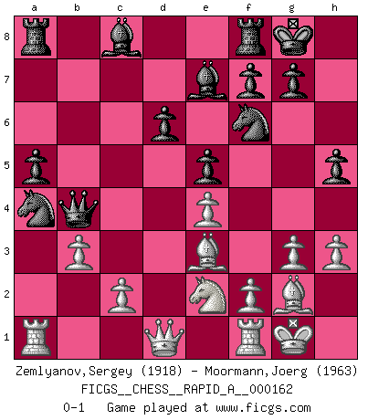 Last move : 0-1 2014 September 1 6:32:11 [Event "FICGS__CHESS__RAPID_A__000162"] [Site "FICGS"] [Date "2014.06.18"] [Round "1"] [White "Zemlyanov,Sergey"] [Black "Moormann,Joerg"] [Result "0-1"] [WhiteElo "1918"] [BlackElo "1963"] 1.e4 c5 2.Nf3 d6 3.d4 cxd4 4.Nxd4 Nf6 5.Nc3 a6 6.h3 e5 7.Nde2 h5 8.g3 Nbd7 9.a4 Be7 10.a5 Nc5 11.Bg2 b5 12.axb6 Qxb6 13.O-O O-O 14.b3 a5 15.Be3 Qb4 16.Na4 Nxa4 0-1 This chess game has been lost on time (started : 2014.06.18 20:58:27) Sicilian : Najdorf, Adams attack Kingside Castling by player White (move 13) Kingside Castling by player Black (move 13) Player Black won this chess game. Follow this game move after move (download)The game of Chess is not merely an idle amusement; several very valuable qualities of the mind are to be acquired and strengthened by it, so as to become habits ready on all occasions; for life is a kind of Chess. (Benjamin Franklin) Kasparov ist eine Art Monster mit hundert Augen, denen auch nicht das Geringste entgeht. (Tony Miles) Cuando la partida de Ajedrez termina, el Peón y el Rey regresan a la misma caja. (Irish saying) Psychologiquement, tu dois avoir confiance en toi même, mais cette confiance doit être basée sur des faits. (Robert Fischer) Strategy without tactics is the slowest route to victory. Tactics without strategy is the noise before defeat. (Sun Tzu)