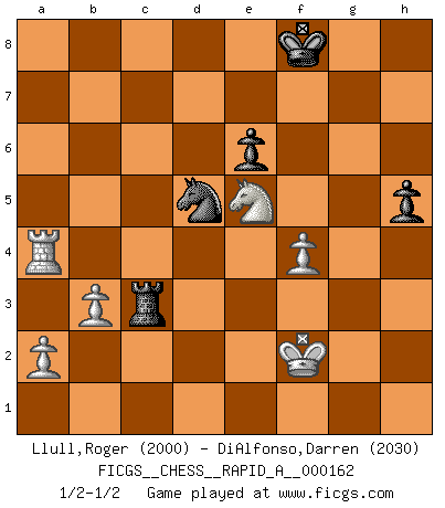 Last move : 1/2-1/2 2014 August 18 18:49:39 [Event "FICGS__CHESS__RAPID_A__000162"] [Site "FICGS"] [Date "2014.06.18"] [Round "1"] [White "Llull,Roger"] [Black "DiAlfonso,Darren"] [Result "1/2-1/2"] [WhiteElo "2000"] [BlackElo "2030"] 1.d4 Nf6 2.c4 e6 3.Nf3 b6 4.g3 Ba6 5.b3 Bb4+ 6.Bd2 Be7 7.Bg2 c6 8.Bc3 d5 9.Nbd2 O-O 10.O-O Bb7 11.Qc2 c5 12.dxc5 bxc5 13.cxd5 exd5 14.Rad1 Nbd7 15.Rfe1 Re8 16.Ne5 Qb6 17.e4 d4 18.Nec4 Qa6 19.Bb2 Rad8 20.Bf1 Qe6 21.f3 Rb8 22.Bc1 Ba8 23.Bd3 g6 24.Nb1 Nh5 25.Qg2 Qc6 26.Nbd2 Bg5 27.Qh3 Re6 28.Na5 Qc7 29.Nac4 Qc6 30.Nf1 Bxc1 31.Rxc1 Kg7 32.Nfd2 Nhf6 33.g4 Qc7 34.Qg3 Qxg3+ 35.hxg3 h6 36.Nb2 Rc6 37.Rc4 Rb4 38.Rc2 Ne5 39.Be2 g5 40.Nd3 Nxd3 41.Bxd3 Bb7 42.Nc4 Nd7 43.e5 Ba6 44.f4 Kf8 45.Be4 Re6 46.Bf5 Re7 47.Nb2 d3 48.Bxd3 Bxd3 49.Nxd3 Rd4 50.Re3 gxf4 51.gxf4 Nf6 52.Rf3 Nxg4 53.Rxc5 Red7 54.Nf2 h5 55.e6 R7d5 56.Rc7 fxe6 57.Rxa7 Rc5 58.Rd3 Rc1+ 59.Kg2 Rxd3 60.Nxd3 Rc3 61.Ne5 Ne3+ 62.Kf2 Nd5 63.Ra4 Ke7 64.Ra7+ Kf8 65.Ra4 1/2-1/2 Queen's Indian : Nimzovich variation (exaggerated Fianchetto) Kingside Castling by player Black (move 9) Kingside Castling by player White (move 10) This chess game ended in a draw. Follow this game move after move (download)By this measure (on the gap between Fischer & his contemporaries), I consider him the greatest world champion. (Garry Kasparov) Wir können eben der zündenden Macht des Opfers nicht wiederstehen, denn die Begeisterung für das Opfer liegt in der Natur des Menschen. (Rudolf Spielmann) Yo considero que Fischer es uno de los expertos mas grandes de aperturas de siempre. (Keith Hayward) À la honte des hommes, on sait que les lois du jeu sont les seules qui soient partout justes, claires, inviolables et exécutées. Pourquoi l'Indien qui a donné les règles du jeu d'échecs est-il obéi de bon gré dans toute la terre, et que les décrétales des papes, par exemple, sont aujourd'hui un objet d'horreur et de mépris ? C'est que l'inventeur des échecs combina tout avec justesse pour la satisfaction des joueurs, et que les papes, dans leurs décrétales, n'eurent en vue que leur seul avantage. L'Indien voulut exercer également l'esprit des hommes et leur donner du plaisir; les papes ont voulu abrutir l'esprit des hommes. Voltaire (Dictionnaire philosophique / Garnier 1967) All the troubles of the world come from being unable to sit alone in a quiet room. (Blaise Pascal)