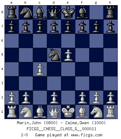 Last move : 1-0 2007 April 5 22:3:3 [Event "FICGS__CHESS__CLASS_G__000011"] [Site "FICGS"] [Date "2007.02.16"] [Round "1"] [White "Marin,John"] [Black "Zalme,Owen"] [Result "1-0"] [WhiteElo "0800"] [BlackElo "1000"] 1.e4 Nf6 2.e5 Nd5 3.c4 1-0 This chess game has been lost on time (started : 2007.02.16 19:11:46) Alekhine's defense Player White won this chess game. Follow this game move after move (download)If your opponent offers you a draw, try to work out why he thinks he's worse off. (Nigel Short) Als er Schachweltmeister wurde ließ er praktisch alle stärksten Sovietspieler für sich arbeiten. Wenn ein auch nur mittelmässiger Meister ein Spezialist für eine bestimmte Eröffnung war, wurde er von Karpov gerufen. Das wurde alles geheim gehalten. (Mikhail Moiseyevich Botvinik) Las combinaciones han sido siempre el aspecto más intrigante del Ajedrez. Los Maestros las buscan, el público las aplauden, los críticos las alaban. La razón se debe a que las combinaciones hacen posible que el Ajedrez sea más que un ejercicio matemático con una carencia de vida. Ellas son la poesía del juego, son del Ajedrez lo que la melodía es de la música. Ellas representan el triunfo de la mente sobre la materia. (Reuben Fine) A chaque perte on perd un peu de soi. (Joël Lautier) After growing wildly for years, the field of computing appears to be reaching its infancy. (John Pierce)