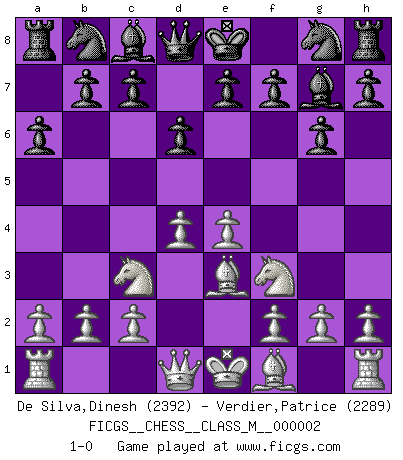 Last move : 1-0 2006 July 18 2:12:28 [Event "FICGS__CHESS__CLASS_M__000002"] [Site "FICGS"] [Date "2006.04.10"] [Round "1"] [White "De Silva,Dinesh"] [Black "Verdier,Patrice"] [Result "1-0"] [WhiteElo "2392"] [BlackElo "2289"] 1.e4 g6 2.d4 Bg7 3.Nc3 d6 4.Be3 a6 5.Nf3 1-0 This chess game has been lost on time (started : 2006.04.10 11:52:44) Robatsch (Modern) defense Player White won this chess game. Follow this game move after move (download)Chess is a foolish expedient for making idle people believe they are doing something very clever when they are only wasting their time. (George Bernard Shaw) Du musst Deinen Gegner in einen tiefen dunklen Wald führen wo 2+2=5 ist und wo der Weg, der wieder hinausführt, nur breit genug für einen ist. (Mikhail Nekhemyevich Tal) Con el fin de mejorar tu juego, debes de estudiar los finales antes que todo, ya que mientras que los finales pueden ser estudiados y dominados por sí mismos, el juegomedio y la apertura deben de ser estudiados en relación con los finales. (José Raúl Capablanca) Les réformistes prétendent que les progrès de la théorie conduiront à la disparition des échecs, et qu'il faut, pour leur rendre vie, en remanier les règles. En réalité, qu'exprime cette affirmation? Le mépris de l'intuition, de l'imagination et de tous les autres éléments qui font des échecs un art. (Alexander Alekhine) Crush them ! Make them suffer ! (General Grievous in Star Wars ep.3)