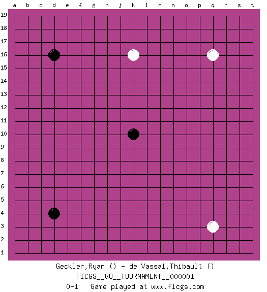 Last move : 0-1 2006 June 29 0:14:45 [Event "FICGS__GO__TOURNAMENT__000001"] [Site "FICGS"] [Date "2006.05.26"] [Round "1"] [Black "Geckler,Ryan"] [White "de Vassal,Thibault"] [Result "0-1"] 1.k10 q16 2.d16 q3 3.d4 k16 0-1 This go game has been lost on time (started : 2006.05.26 10:47:39) Here are the names of the openings (joseki) played in the four corners : Player White won this Go (weiqi, baduk) game. Follow this game move after move (download)The weak player fears ko, the strong player seeks it. (Bill Taylor) The smarter you play, the luckier you'll be. (Mark Pilarski)