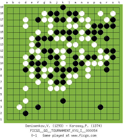 Last move : 0-1 2014 September 6 11:55:34 [Event "FICGS__GO__TOURNAMENT_KYU_I__000054"] [Site "FICGS"] [Date "2014.06.21"] [Round "1"] [Black "Denisenkov,Valentin"] [White "Korossy,Peter"] [Result "0-1"] [Rating 1 "1293"] [Rating 2 "1374"] 1.q16 d4 2.q3 d16 3.r9 o17 4.r14 q18 5.f3 d6 6.d2 c3 7.k4 d10 8.j17 l17 9.f17 d17 10.j15 h16 11.k17 h17 12.h18 g18 13.j18 g17 14.l18 r17 15.r16 k10 16.g10 j12 17.g12 e13 18.g14 h15 19.h14 j14 20.k15 k14 21.m15 h7 22.j9 m13 23.l12 n11 24.l14 l13 25.j11 k11 26.h11 f15 27.k9 o8 28.m9 o9 29.m11 n12 30.n10 o10 31.o11 k12 32.m10 p13 33.p11 l8 34.l9 m8 35.o15 p15 36.p16 o14 37.q15 n15 38.p14 n14 39.n16 o16 40.p15 m16 41.m17 n17 42.m18 l16 43.l15 k6 44.s17 s18 45.s16 q12 46.s12 r11 47.s11 n18 48.k19 q10 49.r10 p10 50.r12 q11 51.e11 f11 52.f10 f12 53.h12 h9 54.j10 g8 55.f14 e14 56.f13 e12 57.e10 d11 58.d9 e9 59.f9 e8 60.f8 f7 61.j7 j6 62.k7 l7 63.k8 h6 64.h8 g9 0-1 Here are the names of the openings (joseki) played in the four corners : Corner q16 : q16 o17 Hoshi (Hwajeom, Seongjeom, Xingwei`) 4-4 Point. The star or hoshi (4-4) point, emphasizing influence at the potential expense of territory. Ikken Kakari (Hankan Keolch'im, Yi Gua`jiao~, 1-Space Low Approach). White 2 is the standard approach move to the 4-4. Corner d4 : d4 f3 Hoshi (Hwajeom, Seongjeom, Xingwei`) 4-4 Point. The star or hoshi (4-4) point, emphasizing influence at the potential expense of territory. Ikken Kakari (Hankan Keolch'im, Yi Gua`jiao~, 1-Space Low Approach). Black 2 is the standard approach move to the 4-4. Corner d16 : d16 j17 Hoshi (Hwajeom, Seongjeom, Xingwei`) 4-4 Point. The star or hoshi (4-4) point, emphasizing influence at the potential expense of territory. Player White won this Go (weiqi, baduk) game. Follow this game move after move (download)Josekis are not fixed, definitive things. They indicate the moments when everything can change. (Pierre Audouard) Programmer - an organism that turns coffee into software. (Anonymous)
